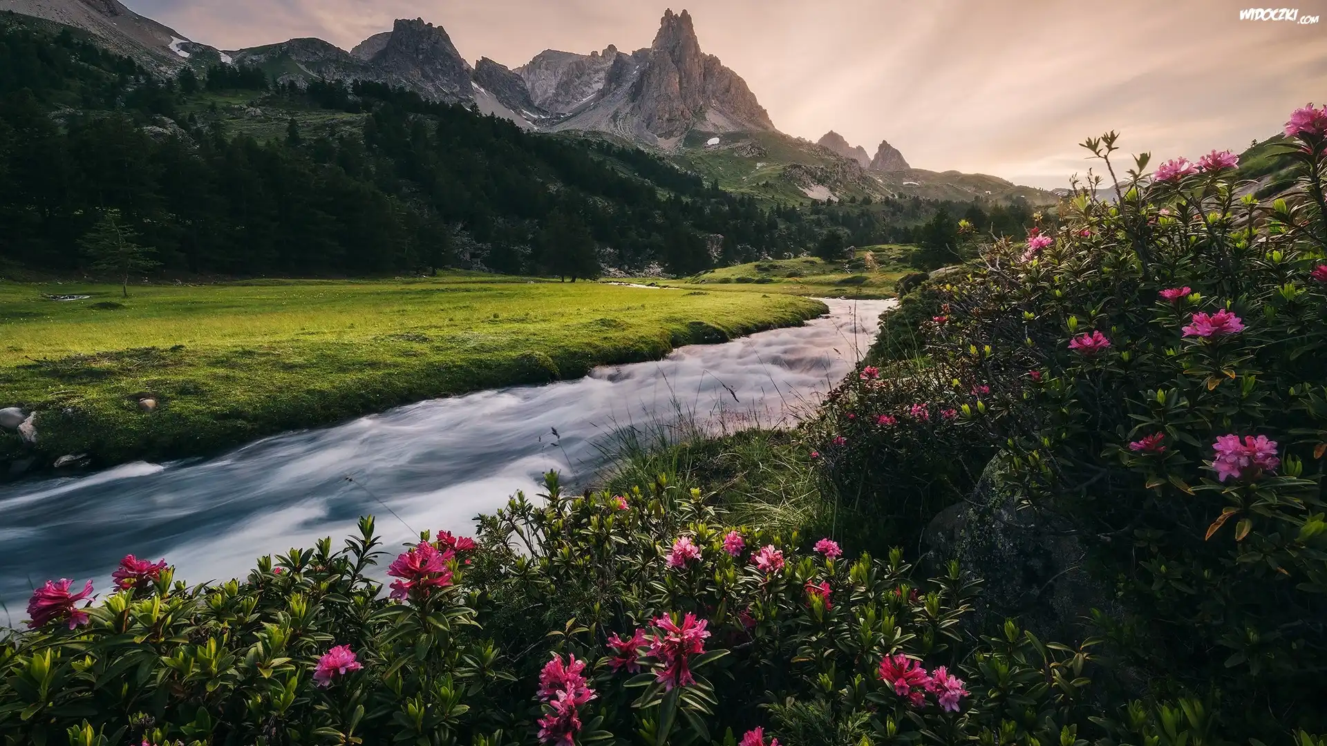Góry, Rzeka, Drzewa, Kwiaty, Różaneczniki