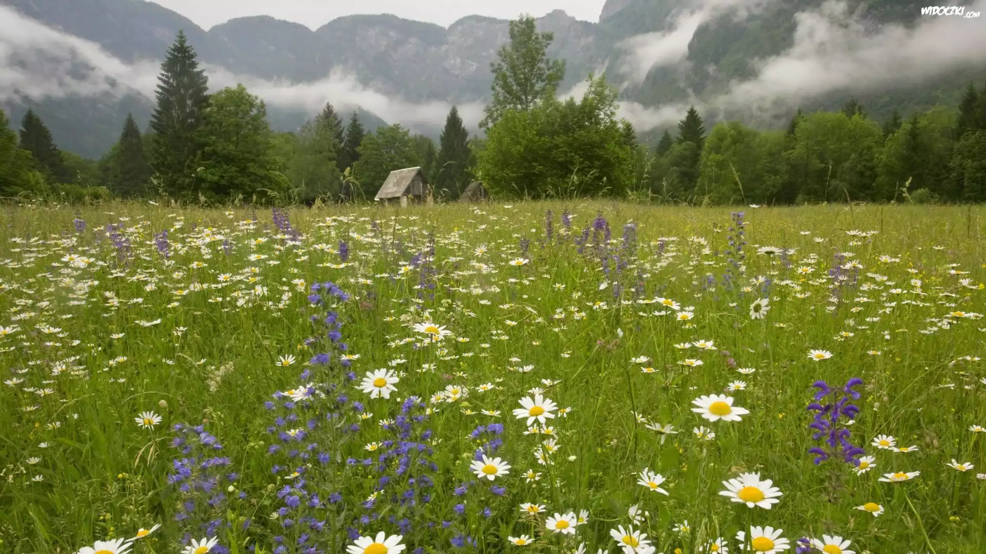 Zdjęcia, Łaki, Kwiaty, Lasy, Góry, Mgła