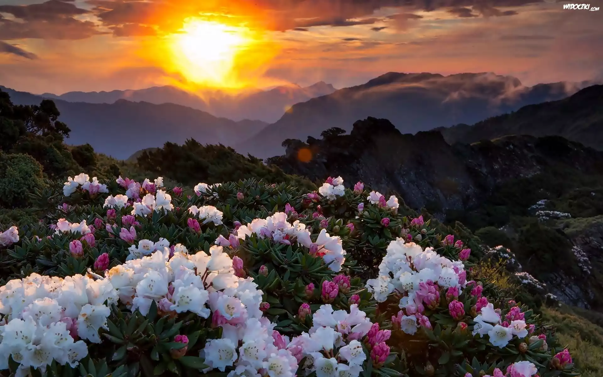 Góry, Zachód Słońca, Kwiaty, Rododendron