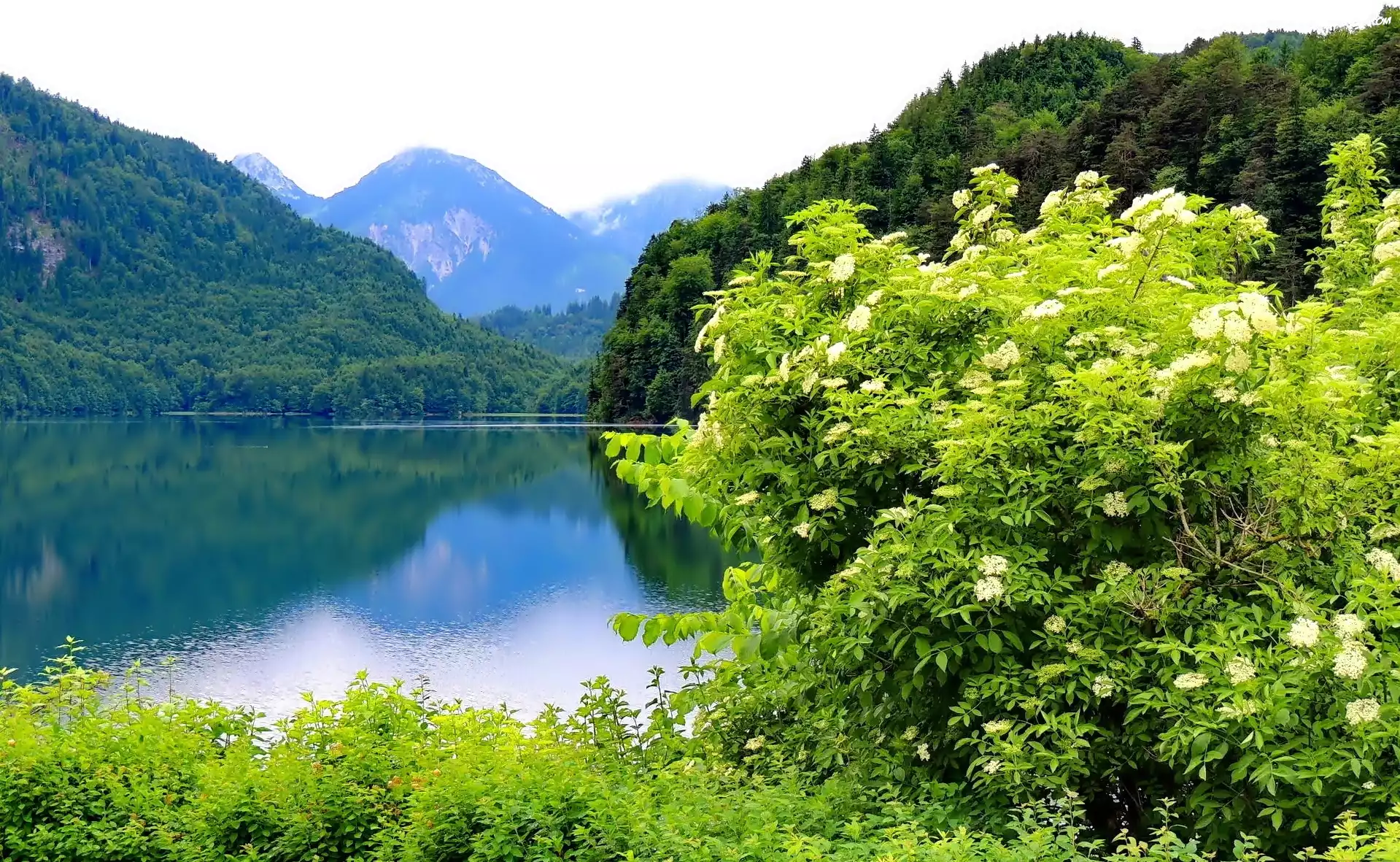 Góry, Las, Jezioro, Kwitnący, Krzew