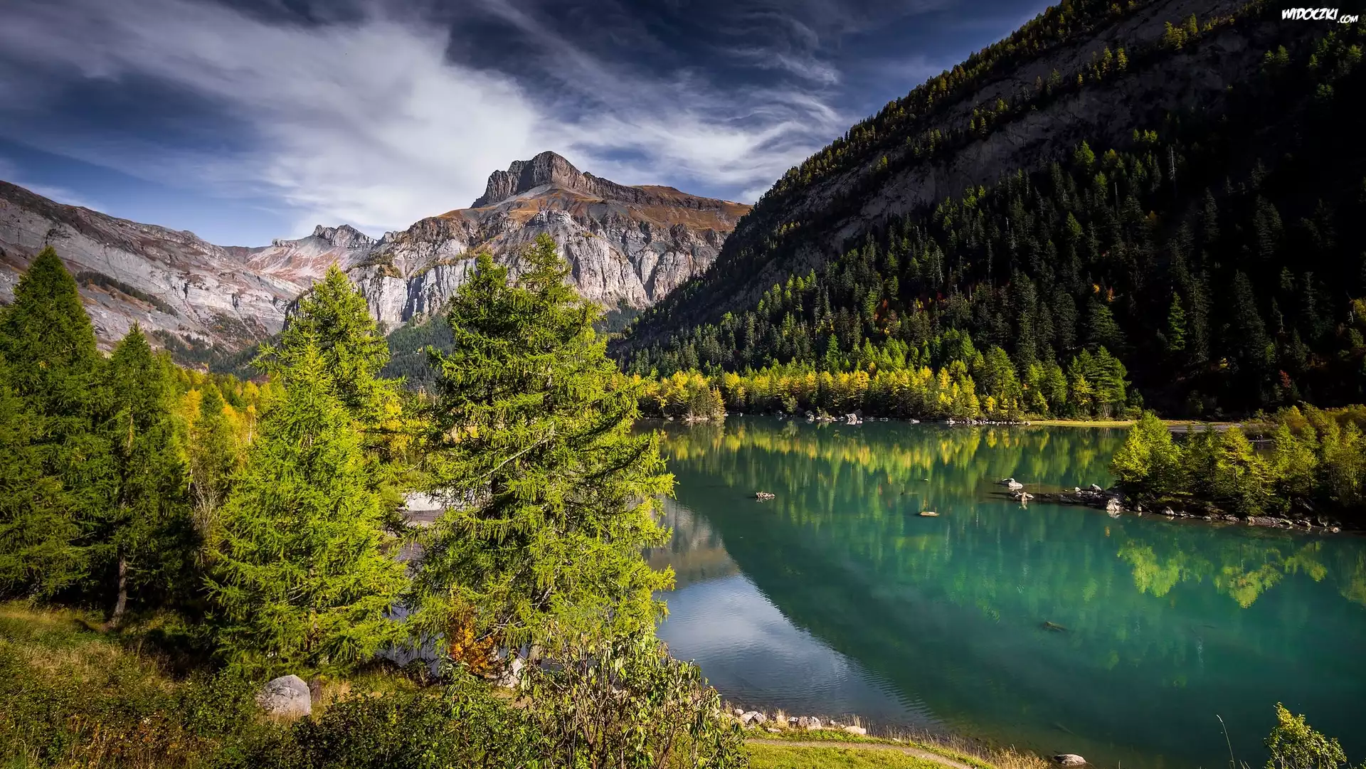 Zdjęcia, Góry, Jezioro, Chmury, Las, Drzewa