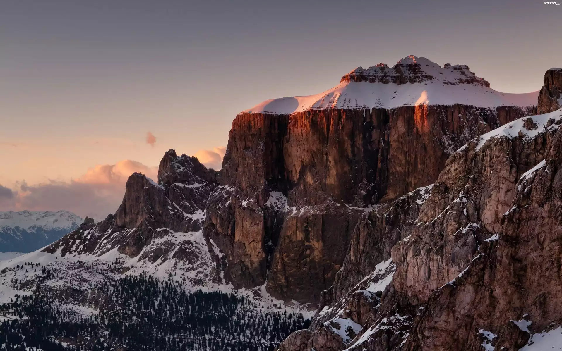 Zdjęcia, Włochy, Prowincja Bolzano, Dolomity, Góry Sassolungo, Niebo, Las, Śnieg