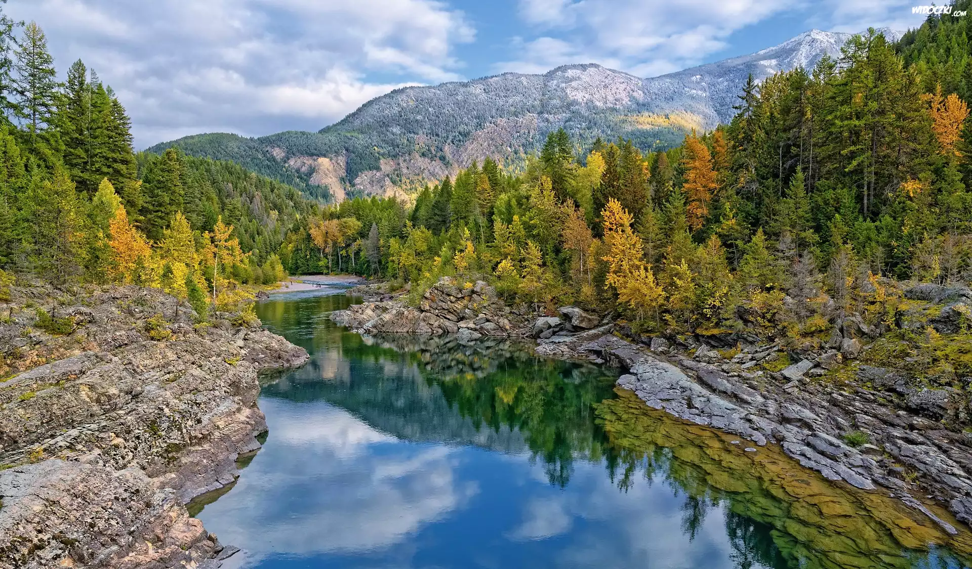 Stany Zjednoczone, Stan Montana, Park Narodowy Glacier, Góry, Rzeka, Flathead River, Las, Drzewa, Jesień, Chmury |