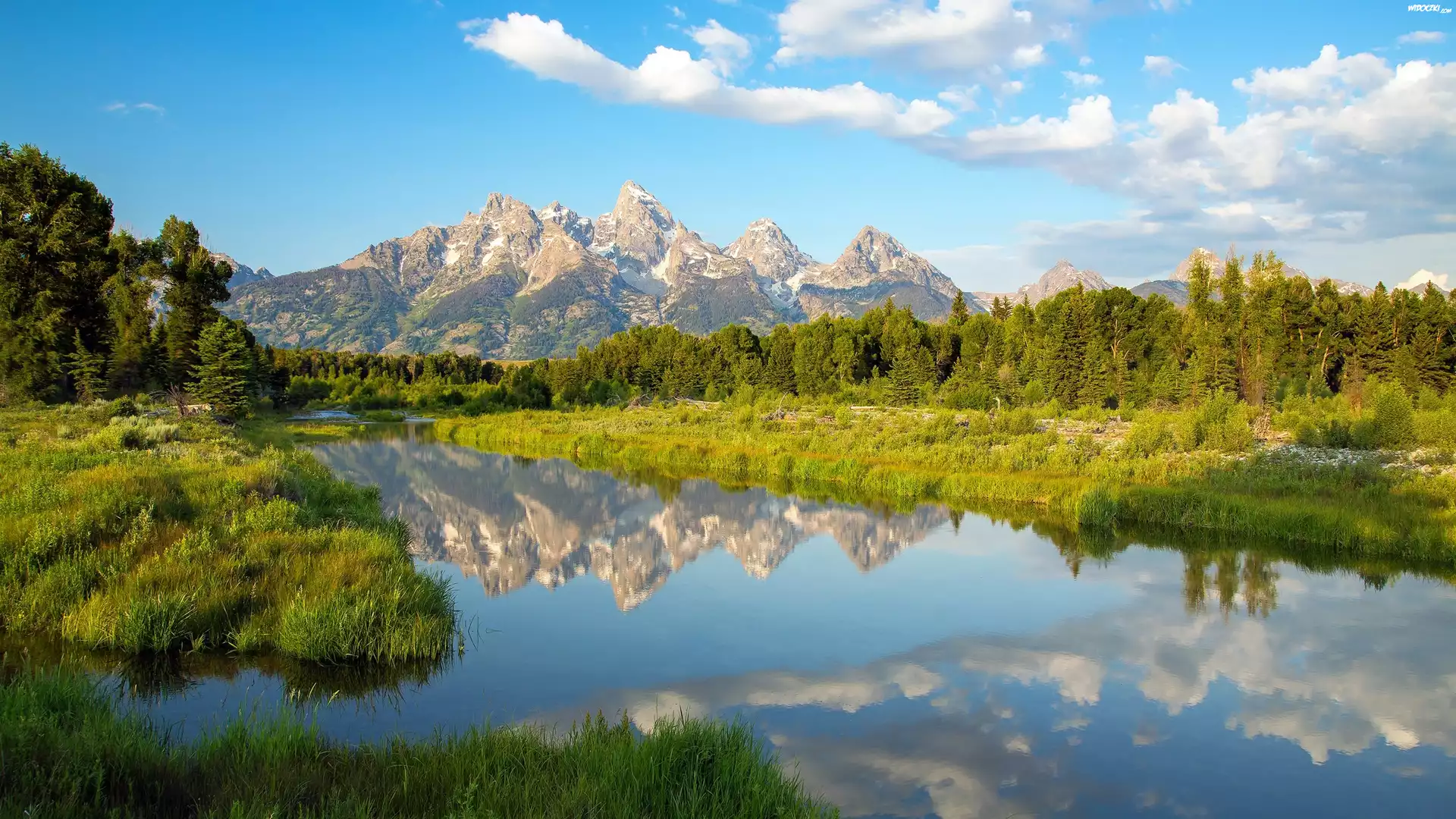 Góry, Rzeka, Las, Chmury