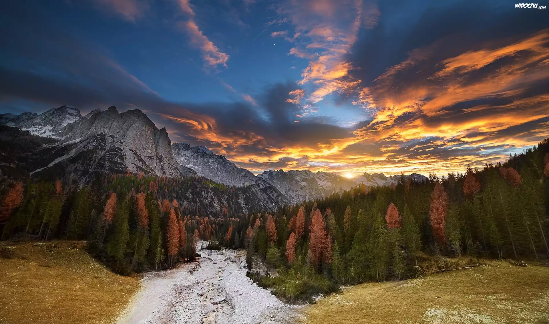 Zdjęcia, Góry, Zachód słońca, Las, Śnieg