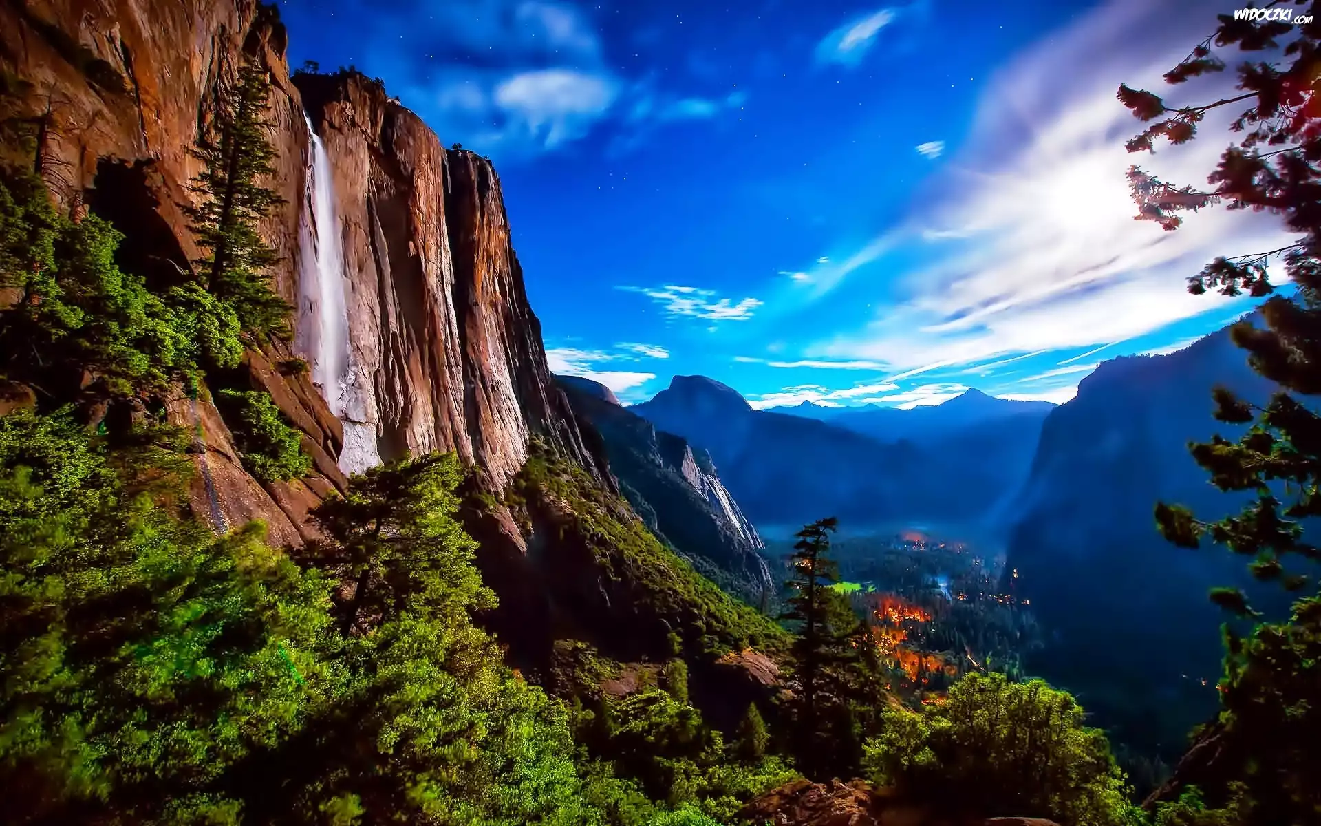 Zdjęcia, Stany Zjednoczone, Stan Kalifornia, Park Narodowy Yosemite, Góry, Drzewa, Wodospad