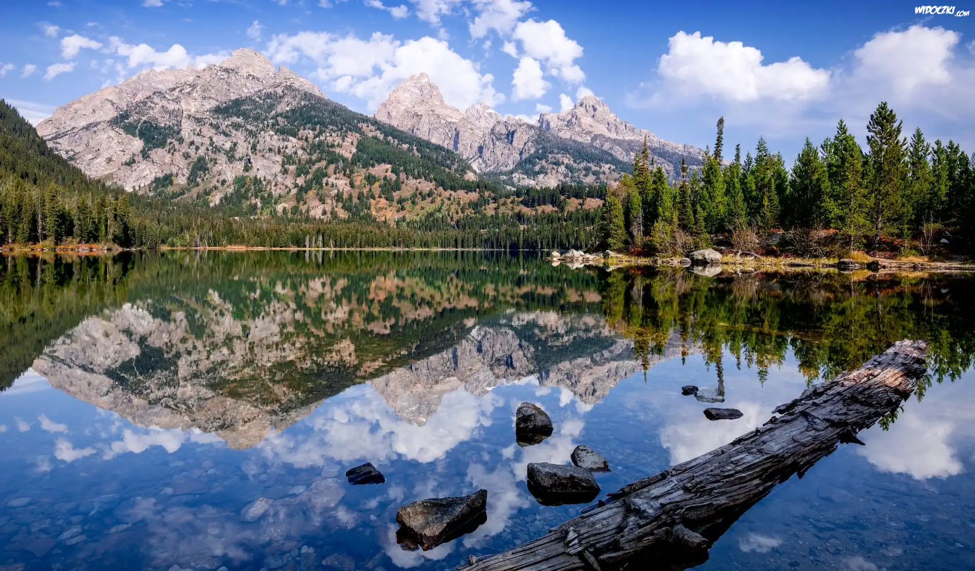 Park Narodowy Grand Teton, Wyoming, Stany Zjednoczone, Góry, Jezioro, Taggart Lake, Las, Drzewa, Chmury Odbicie |