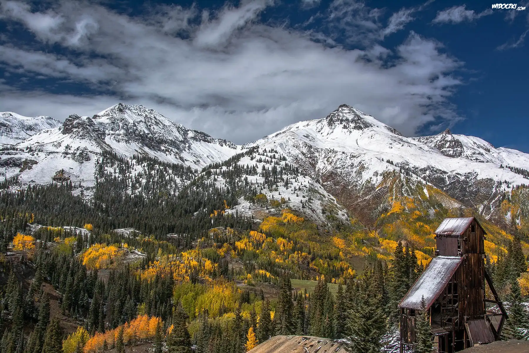 Góry, Śnieg, Jesień, Lasy, Budowla