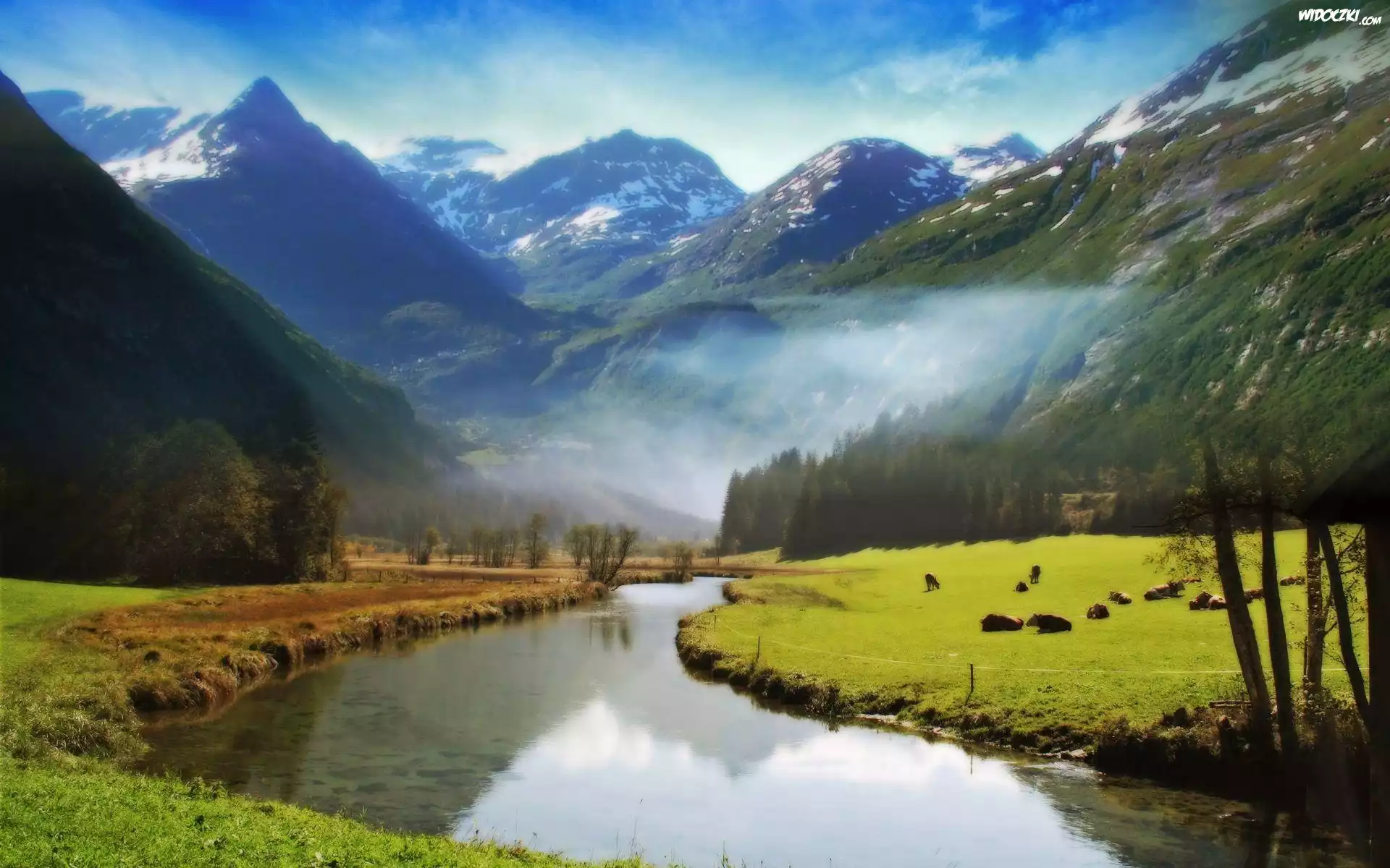 Zdjęcia, Góry, Rzeka, Lasy, Mgła