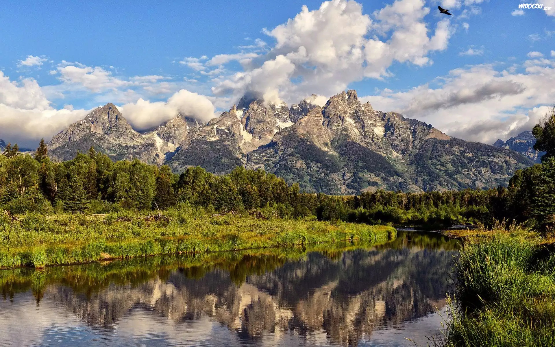 Zdjęcia, Góry, Rzeka, Lasy, Ptak