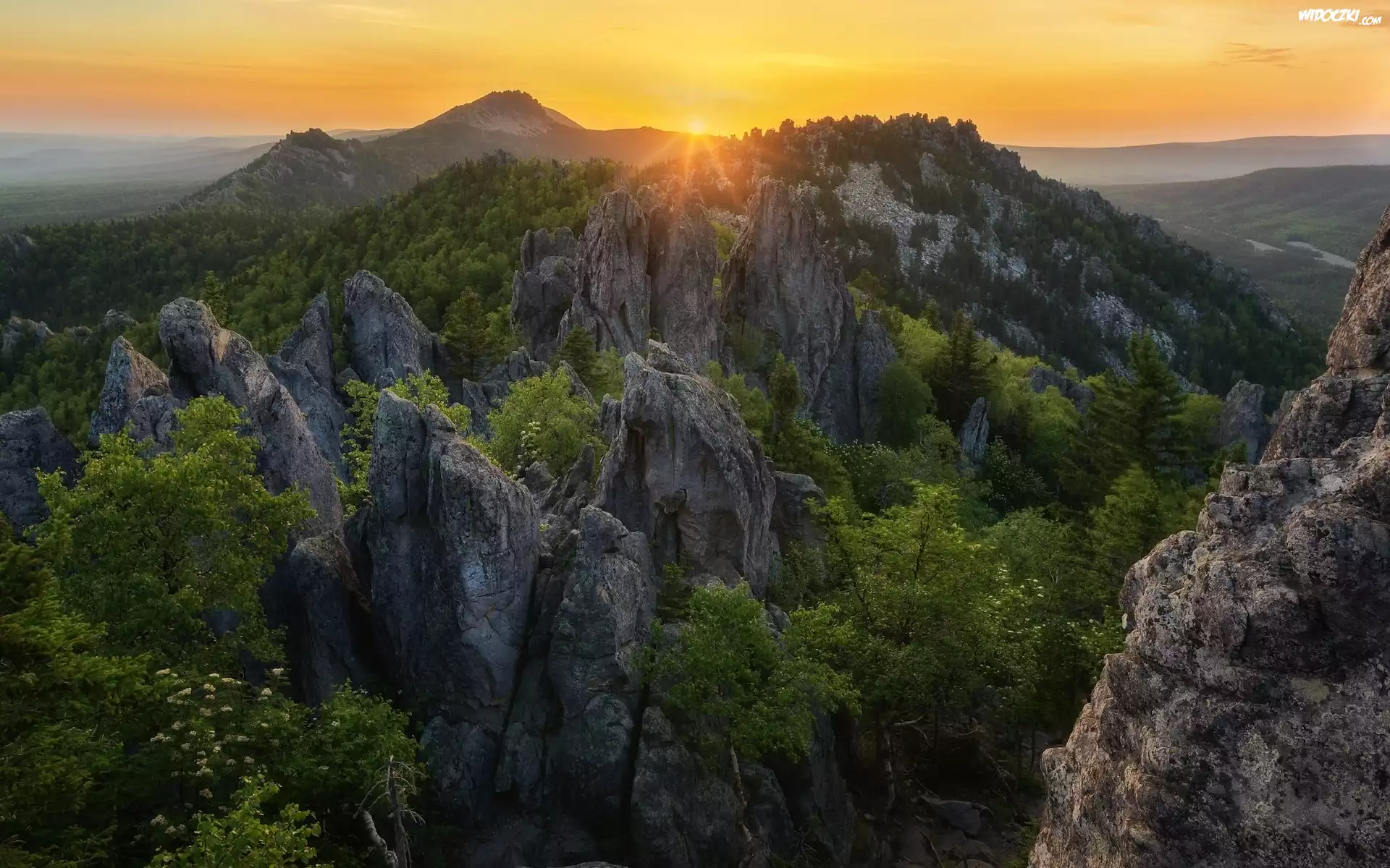 Góry, Wschód słońca, Skały, Lasy, Drzewa