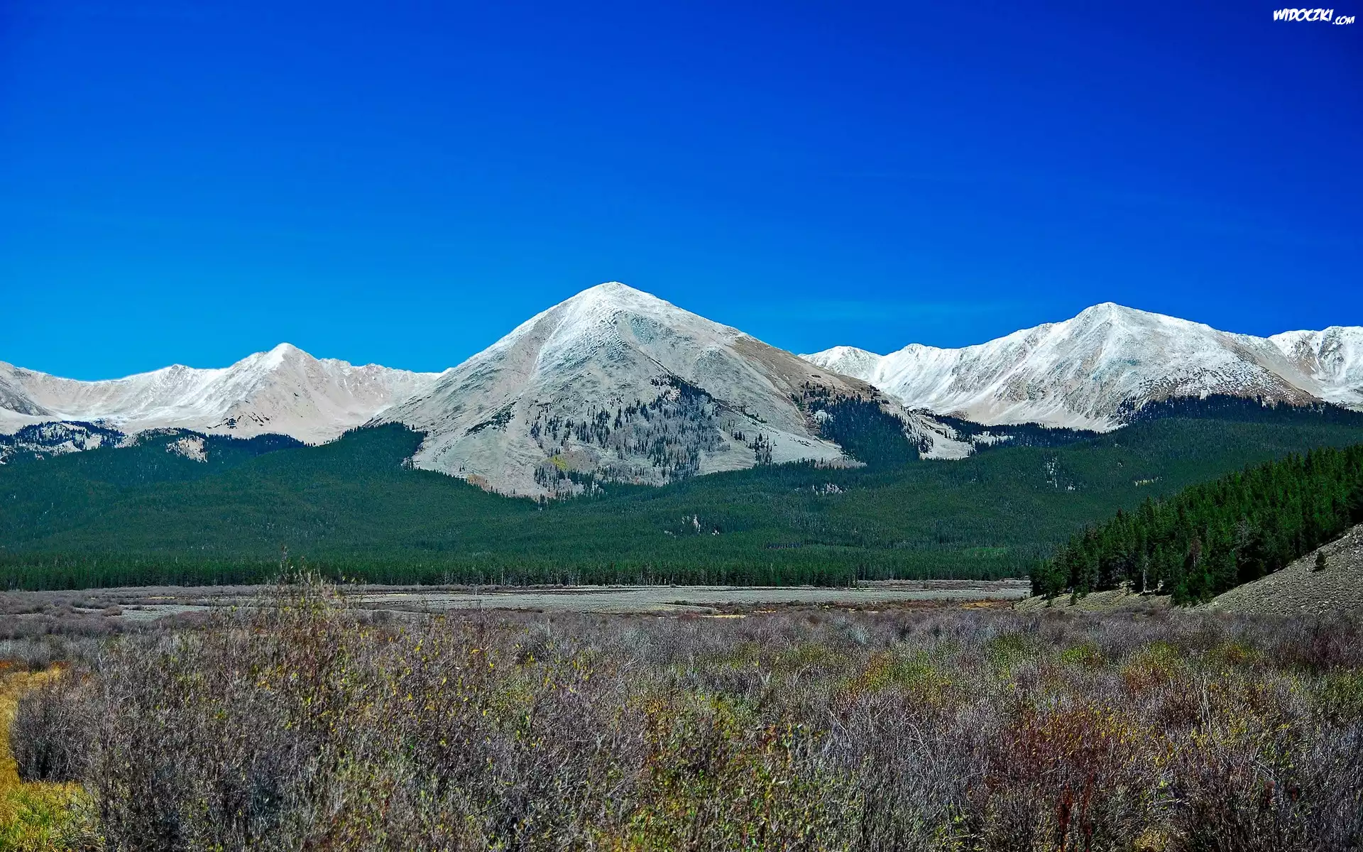 Góry, Ośnieżone, Szczyty, Lasy, Rzeka
