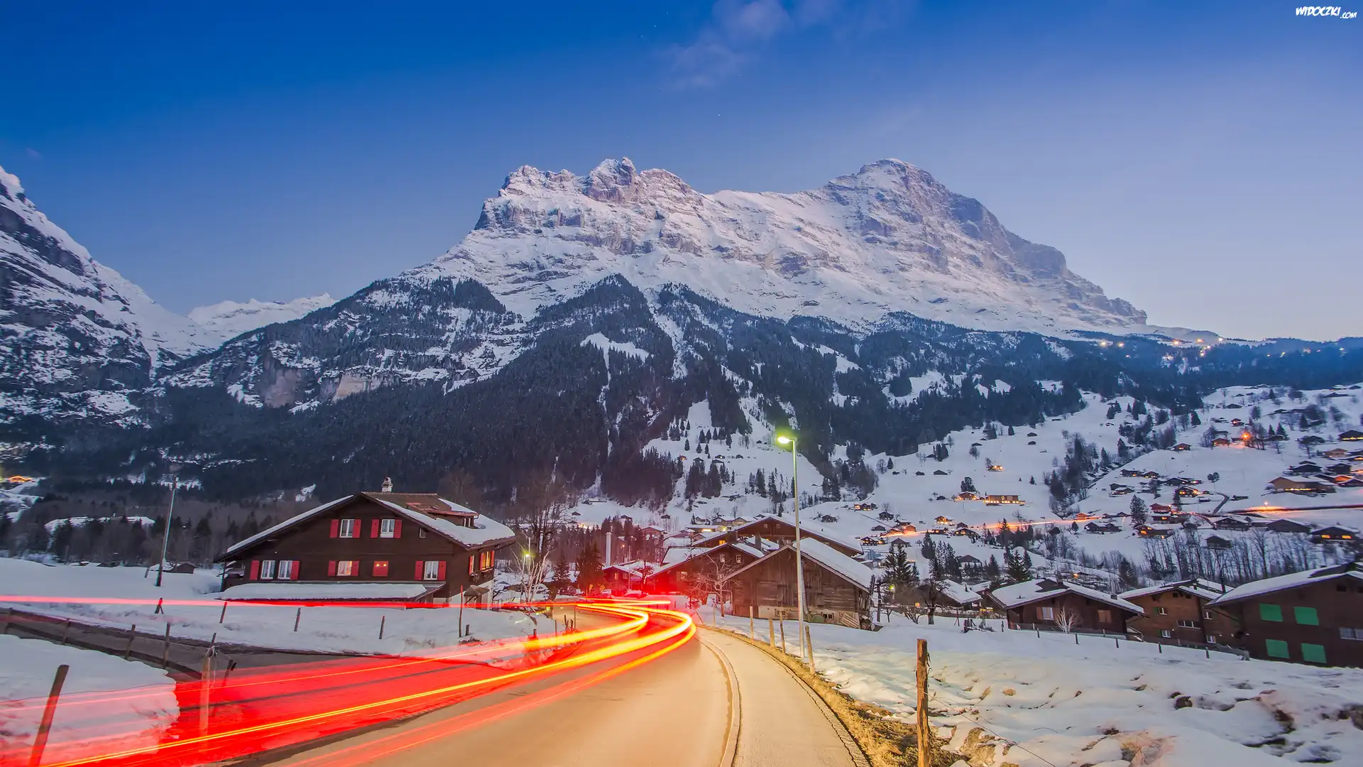 Zdjęcia, Góry, Zima, Droga, Domy, Latarnie, Światła