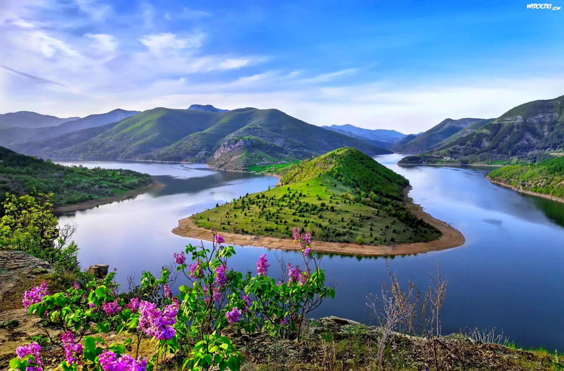 Zdjęcia, Góry, Rzeka, Meander, Kwiaty