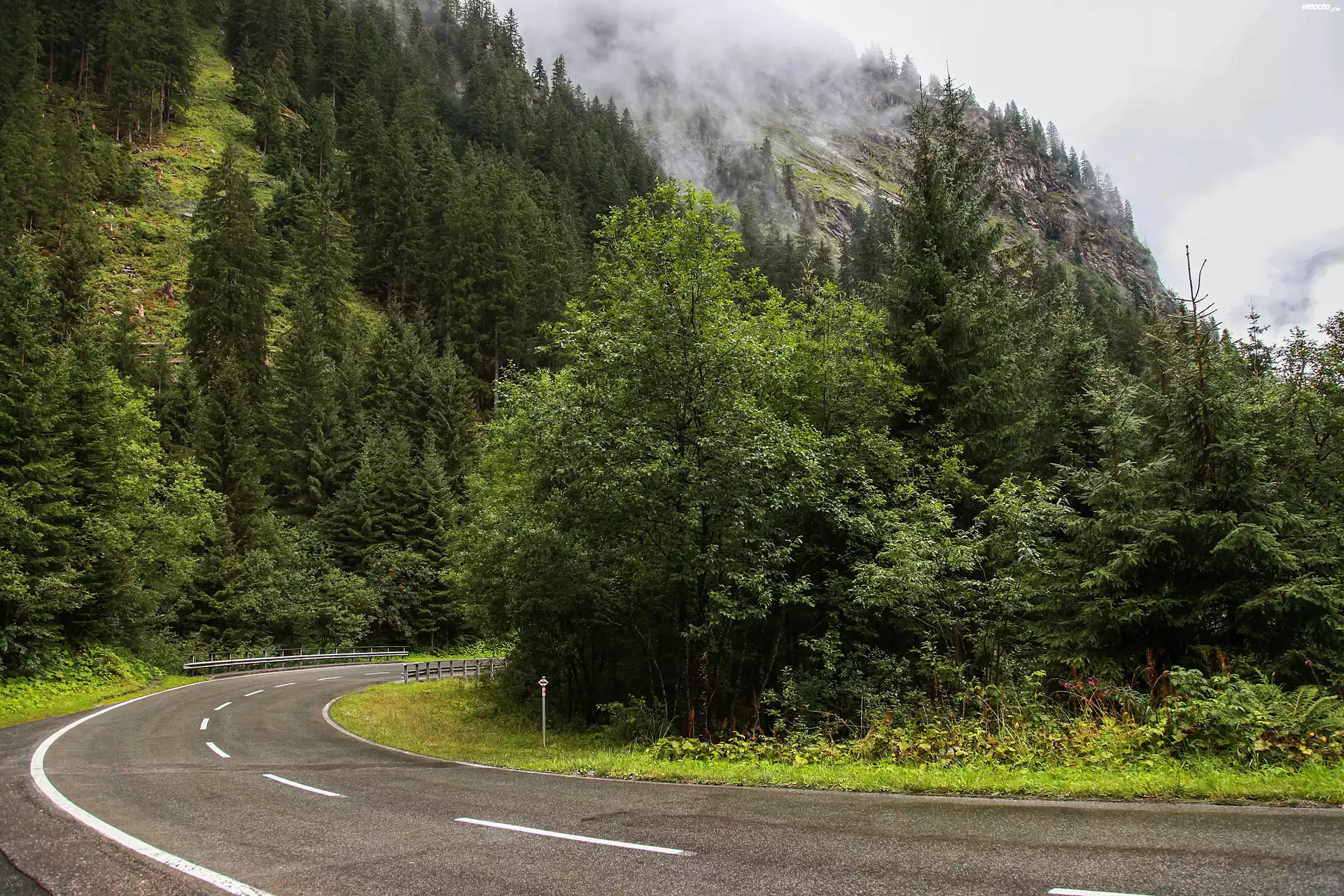 Zdjęcia, Góry, Lasy, Chmury, Mgła, Droga