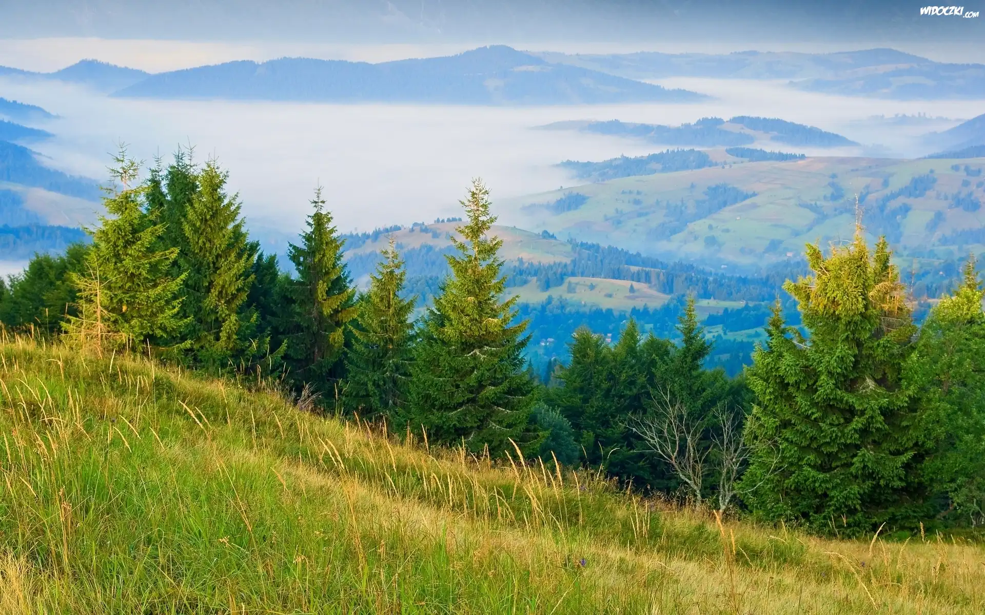 Zdjęcia, Góry, Lasy, Mgła, Panorama