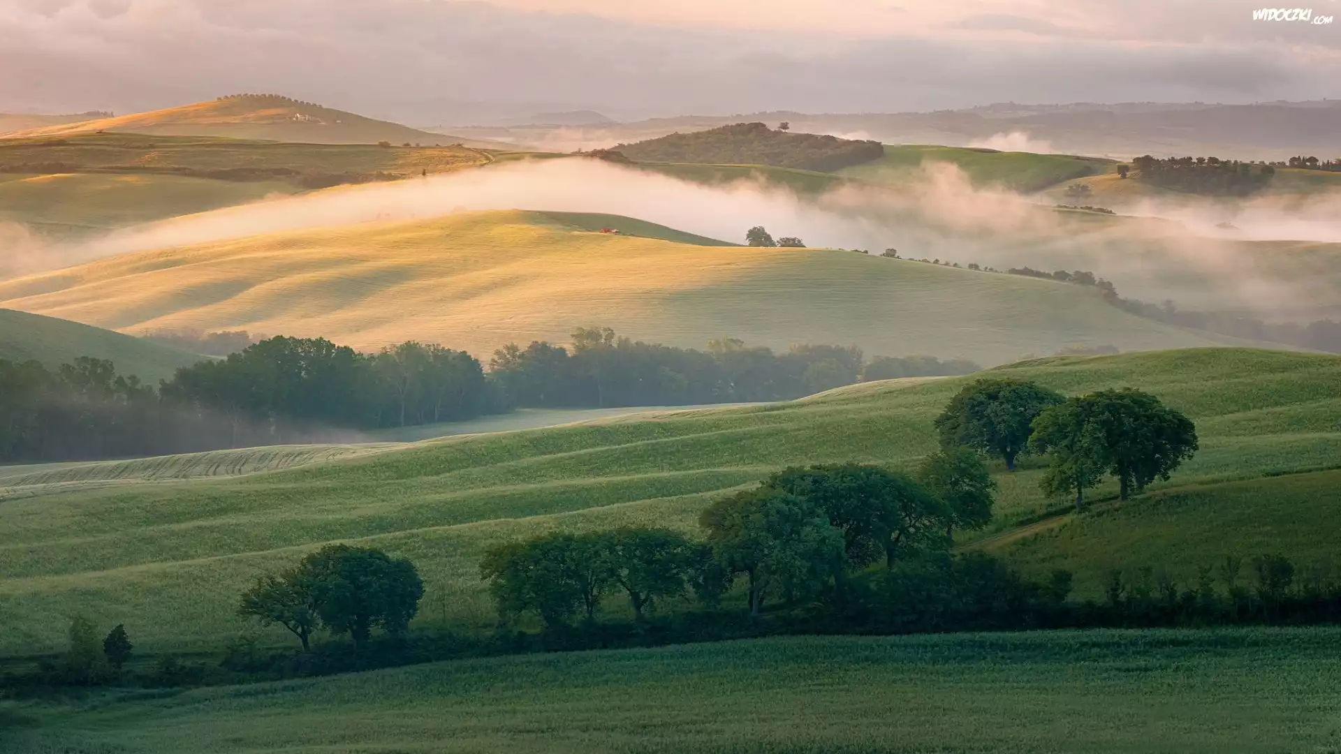 Góry, Łąki, Pola, Lasy, Mgła, Drogi