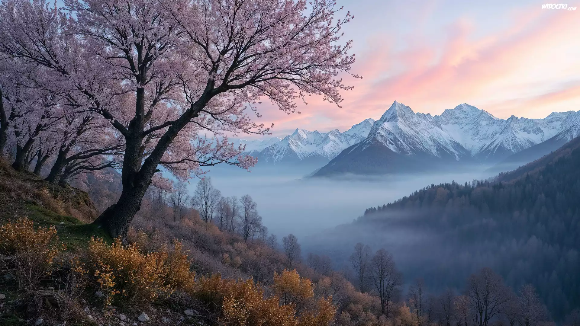 Zdjęcia, Drzewa, Góry, Mgła, Pożółkłe, Rośliny