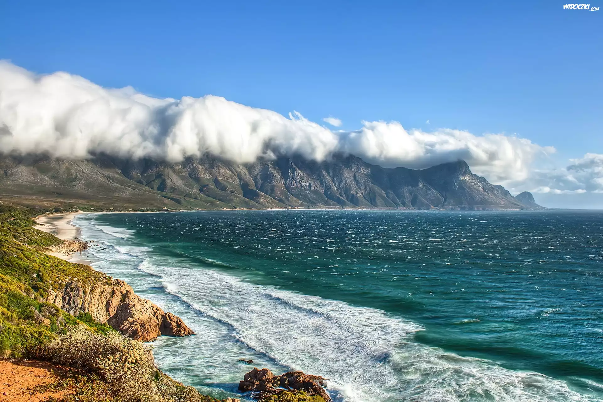 Morze, Góry, Chmury, Kogel Bay, Południowa Afryka