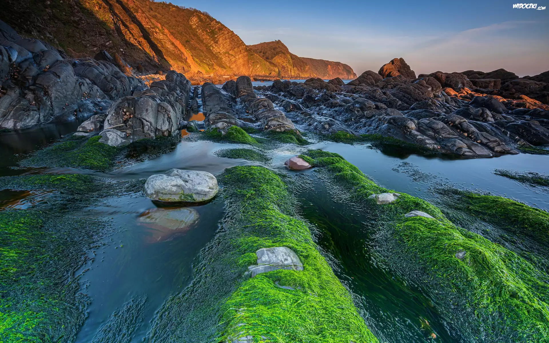 Zdjęcia, Morze, Skały, Kamienie, Glony, Wodorosty, Góry, Wybrzeże, Plaża, Mouthmill Beach, Devon, Anglia