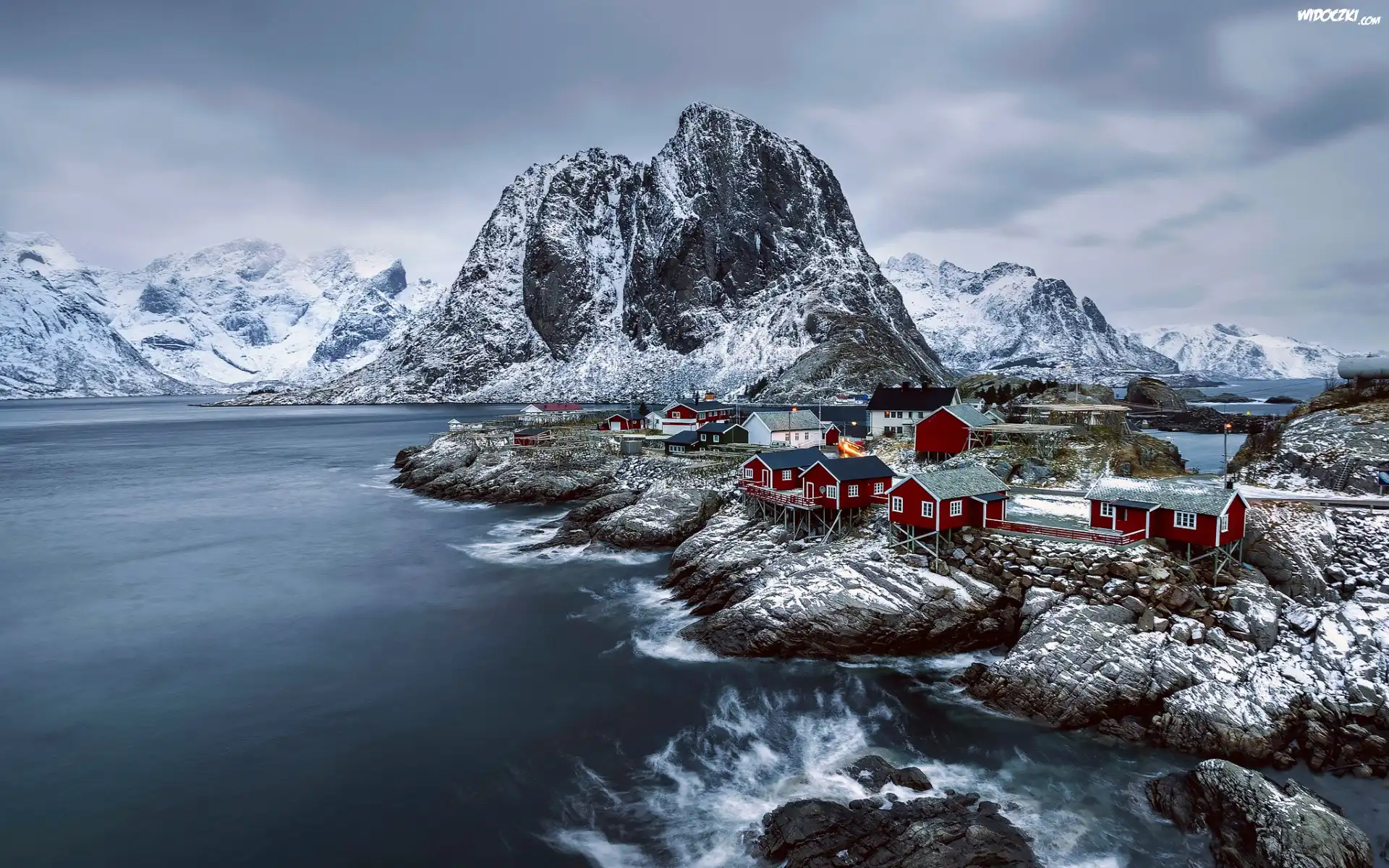 Zdjęcia, Góry, Śnieg, Domki, Morze, Norwegia
