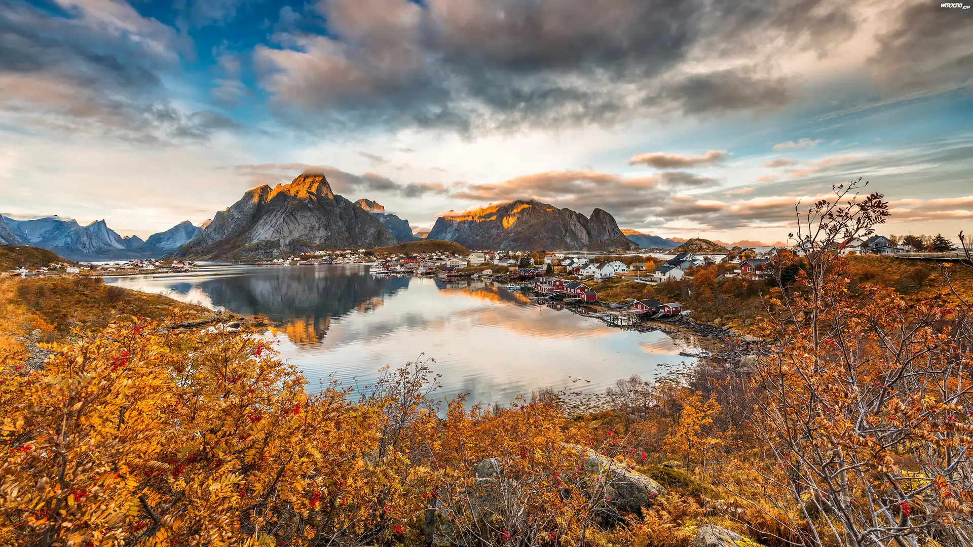 Norwegia, Lofoty, Jesień, Góry, Drzewa, Morze