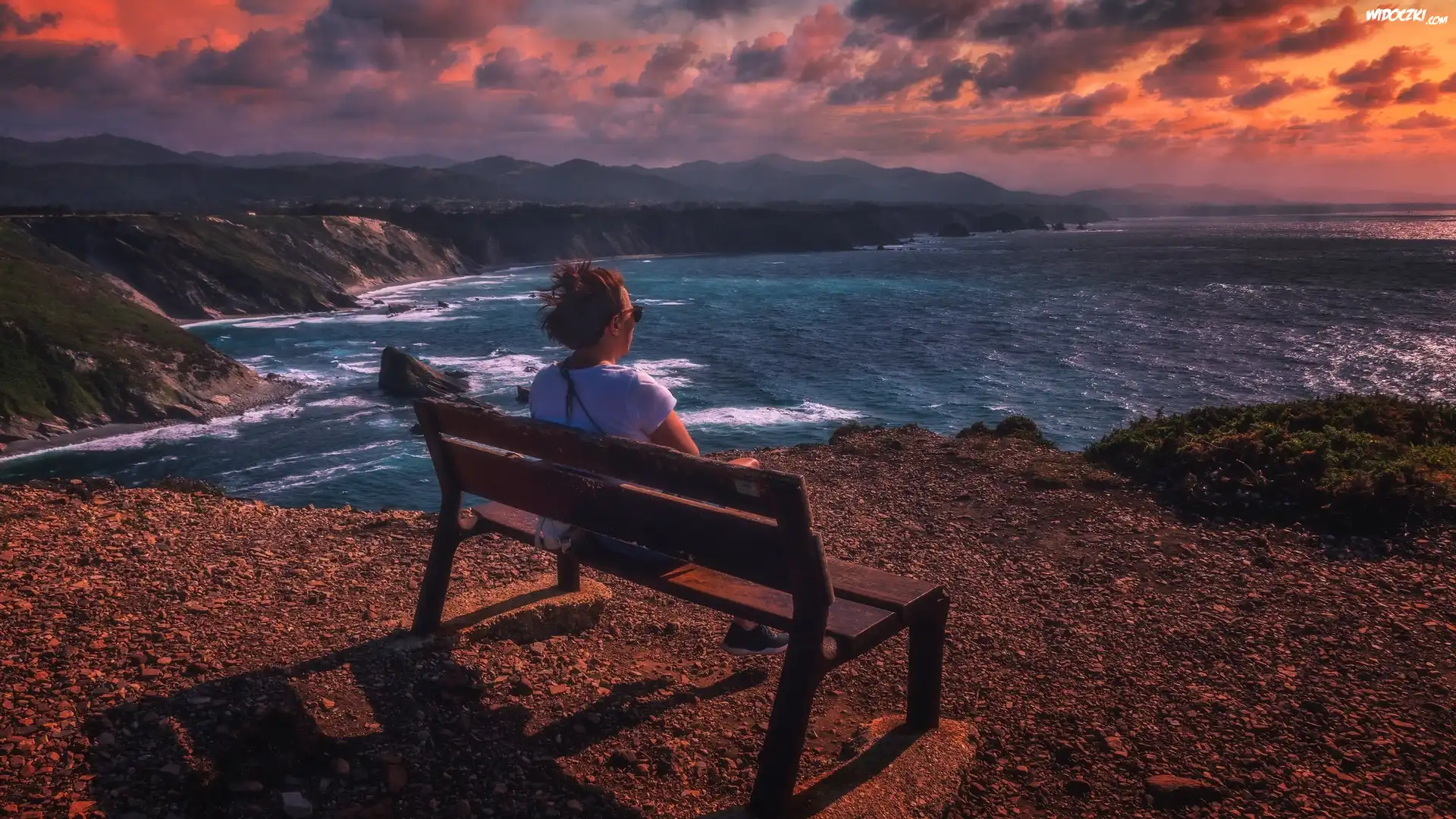 Zdjęcia, Zachód słońca, Morze, Góry, Kamienie, Ławka, Kobieta