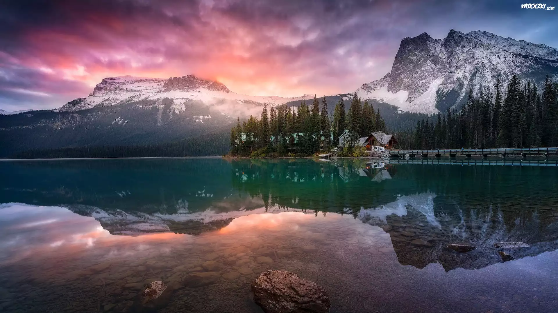 Park Narodowy Yoho, Dom, Most, Jezioro, Emerald Lake, Góry, Drzewa, Prowincja Kolumbia Brytyjska, Kanada |