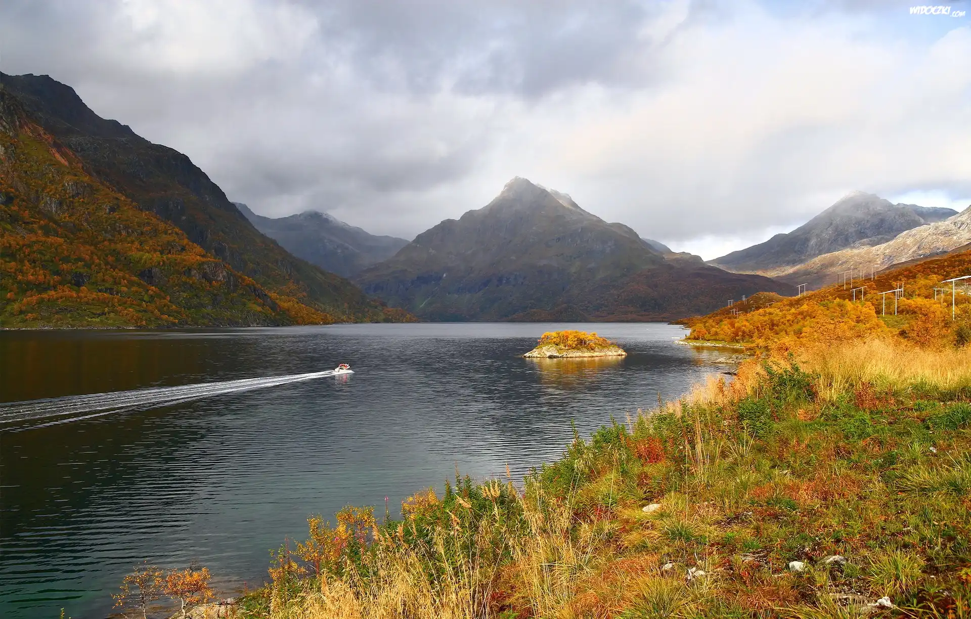 Góry, Jezioro, Wysepka, Motorówka, Jesień