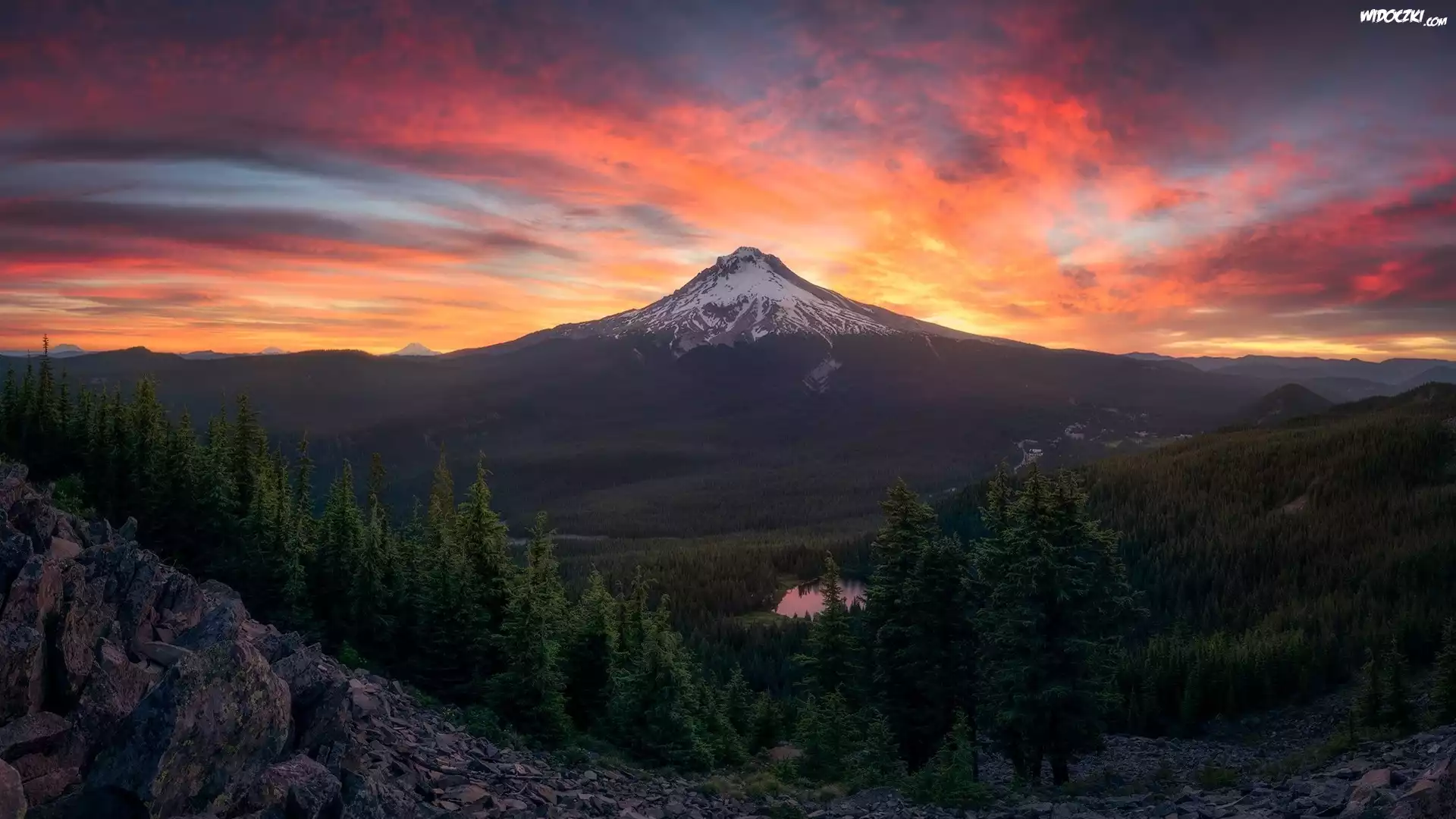 Góry Kaskadowe, Góra Tolmie Peak, Park Narodowy Mount Rainier, Jezioro, Drzewa, Las, Skały, Zachód słońca, Stan Waszyngton, Stany Zjednoczone |