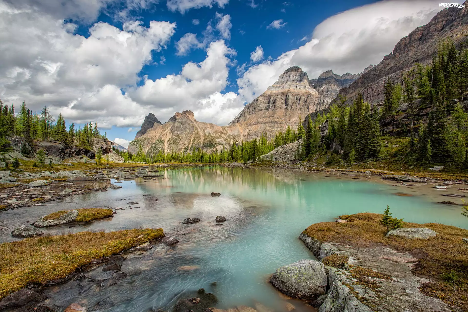 Góry, Góra Odaray Mountain, Jezioro OHara, Płaskowyż Opabin, Park Narodowy Yoho, Drzewa, Chmury, Prowincja Kolumbia Brytyjska, Kanada |