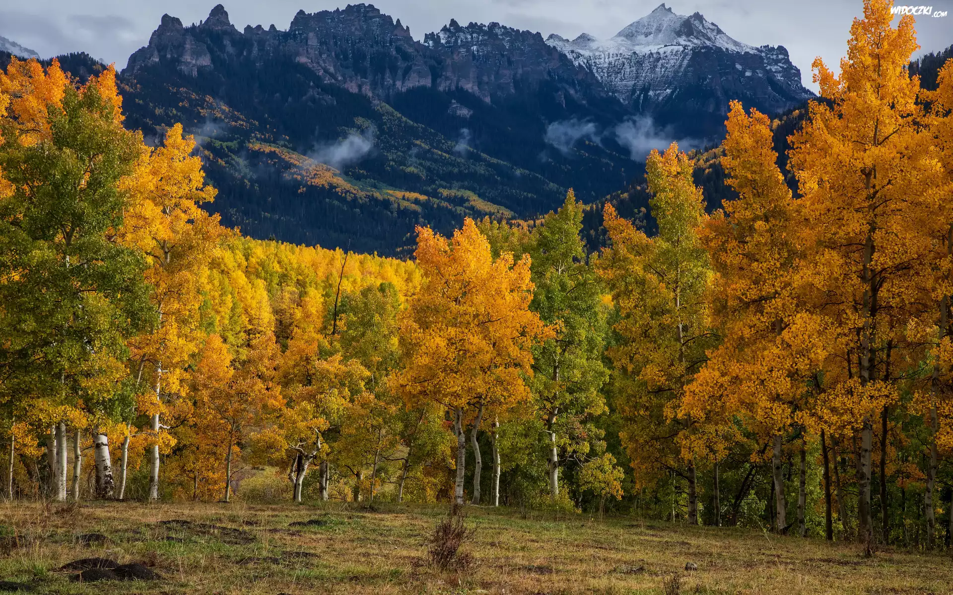 Jesień, Las, Drzewa, Góry, Polana, Niebo