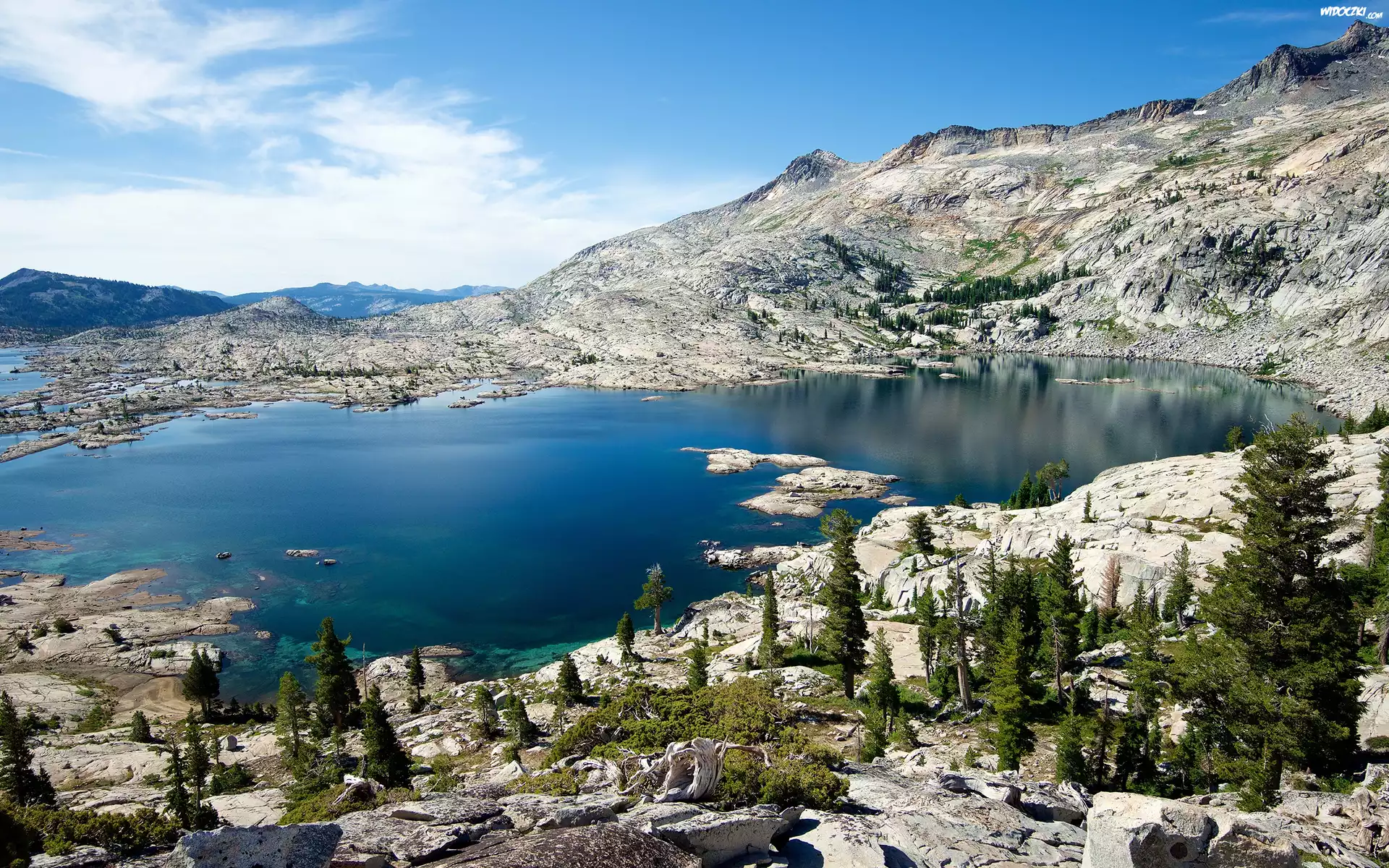 Zdjęcia, Góry, Jezioro, Drzewa, Niebo, Kamienie