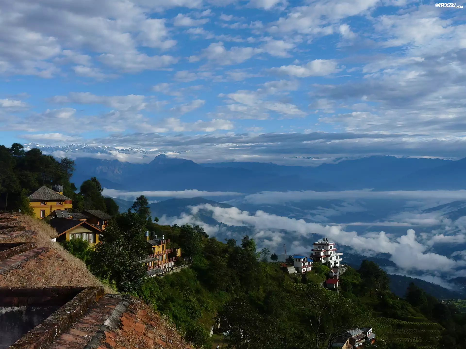 Zdjęcia, Góry, Domy, Lasy, Niebo, Chmury