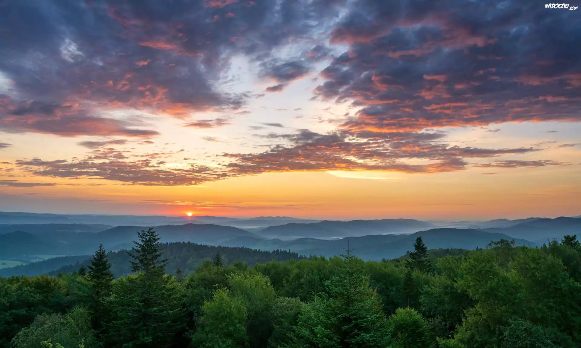 Zdjęcia, Drzewa, Góry, Niebo, Zachód słońca
