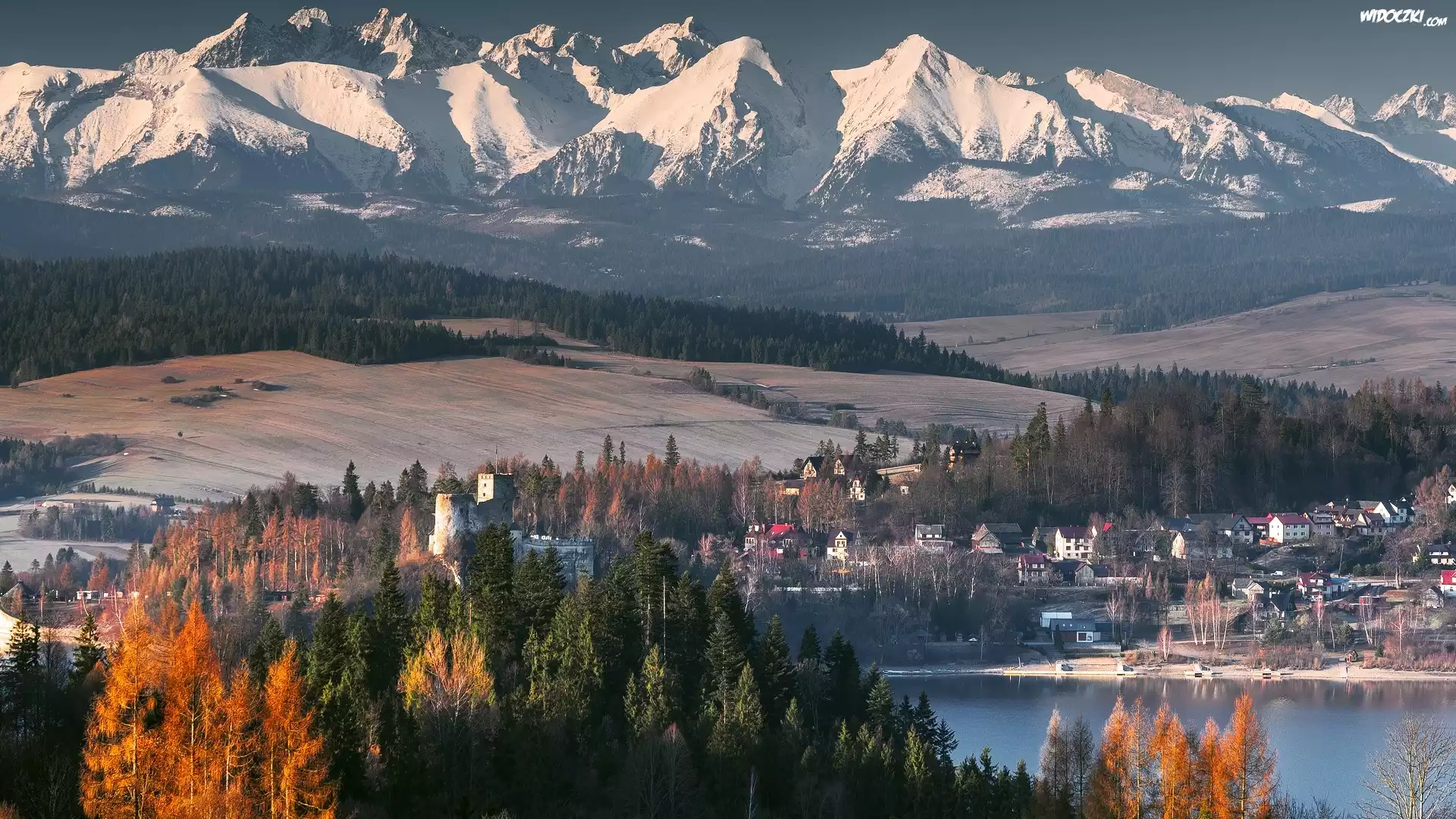 Góry, Tatry, Rzeka, Drzewa, Domy, Zamek Niedzica, Niedzica, Polska