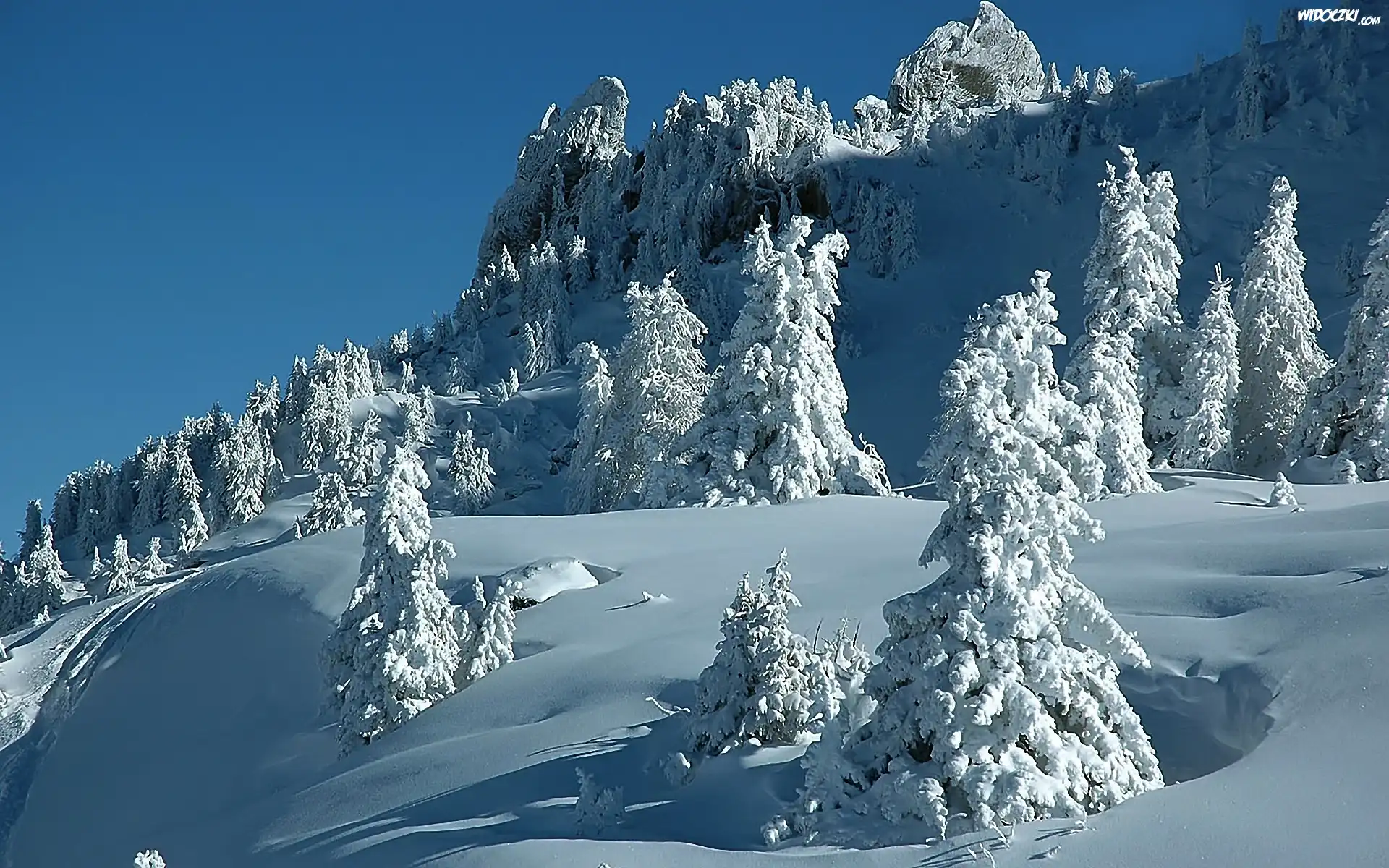 Zdjęcia, Góry, Drzewa, Śnieg, Niebo