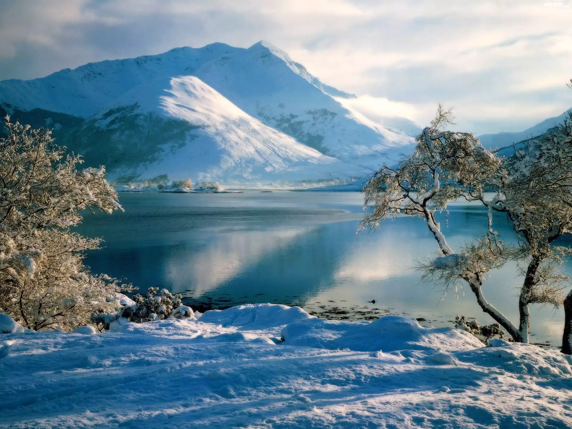 Zdjęcia, Góry, Jezioro, Śnieg, Drzewa