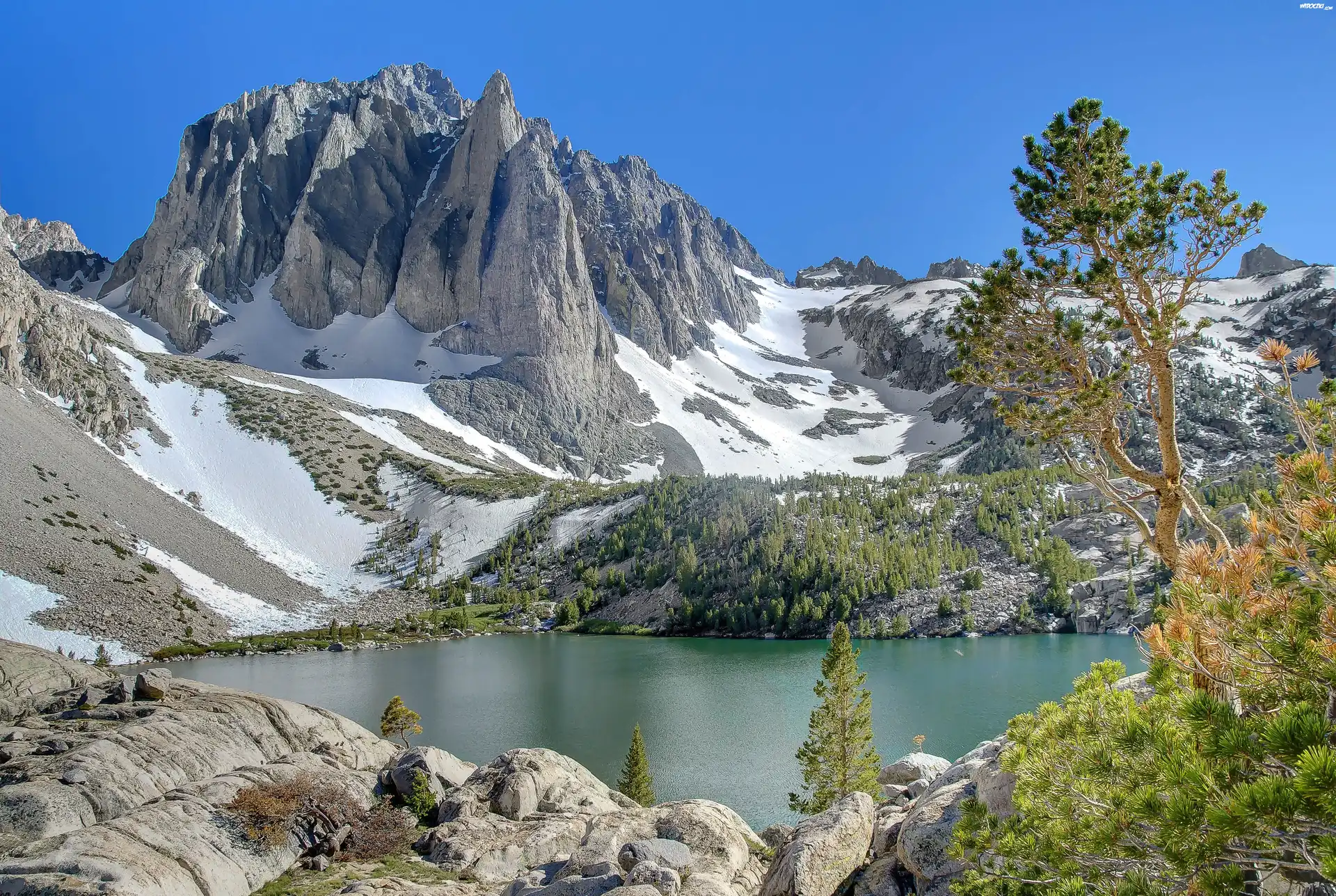 Góry, Jezioro, Śnieg, Roślinność