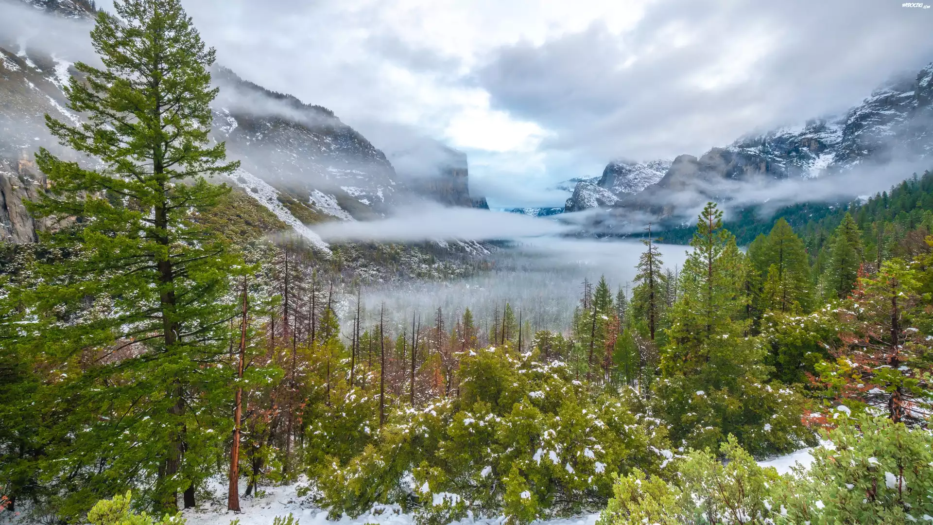 Góry Sierra Nevada, Śnieg, Drzewa, Mgła, Chmury, Park Narodowy Yosemite, Kalifornia, Stany Zjednoczone |