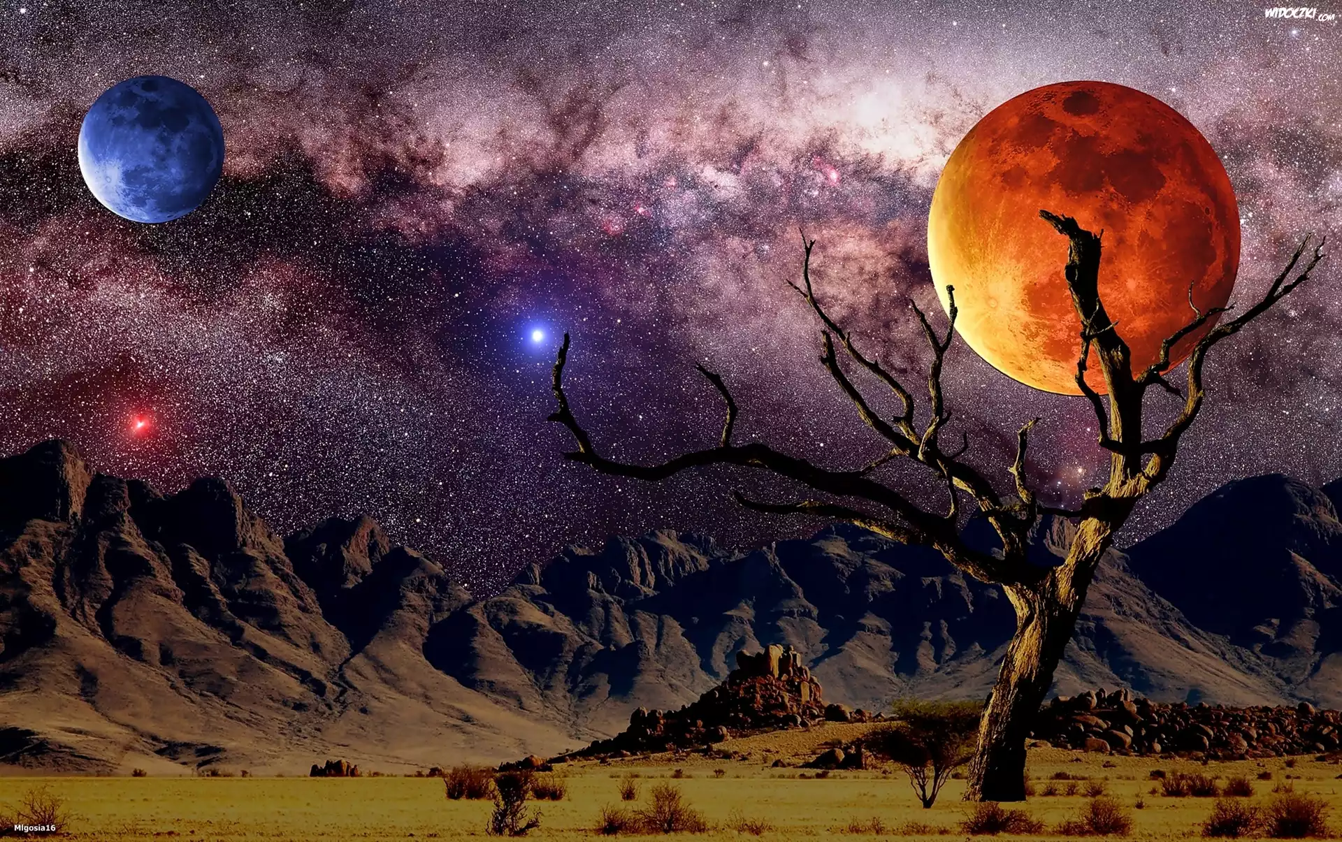 Noc, Góry, Planety, Gwiazdy, Galaktyka, Uschnięte, Drzewo