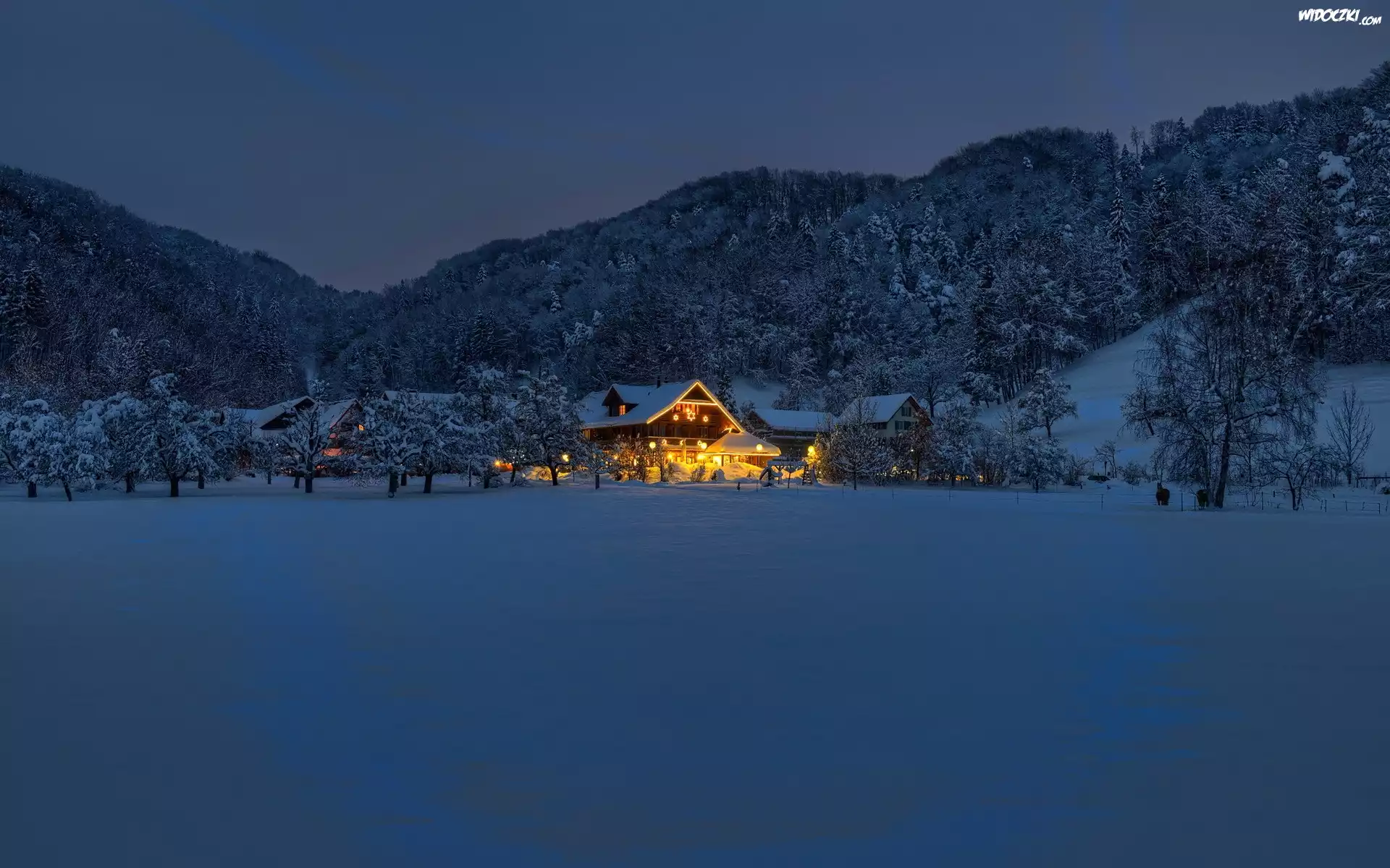 Zdjęcia, Góry, Lasy, Oświetlony, Dom, Noc, Zima