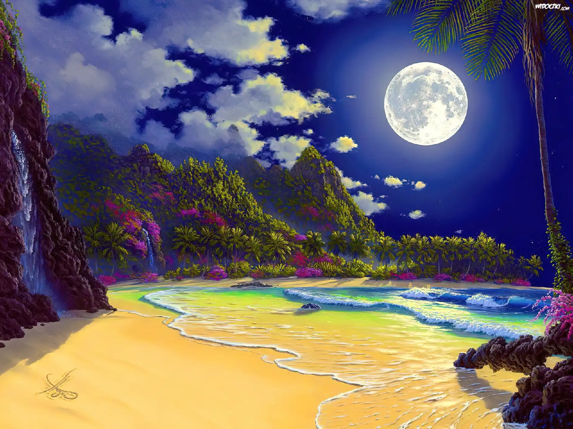 Zdjęcia, Góry, Morze, Plaża, Noc, Księżyc