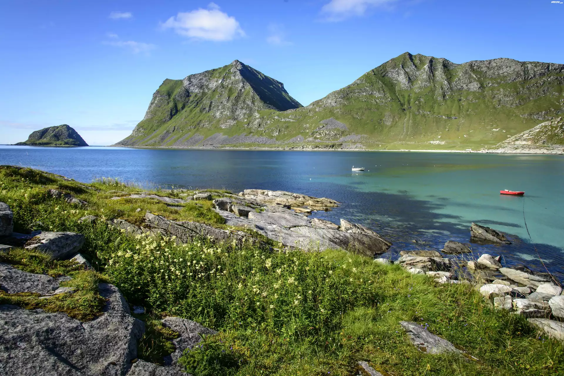 Góry, Jezioro, Kamienie, Łodzie, Norwegia, Roślinność