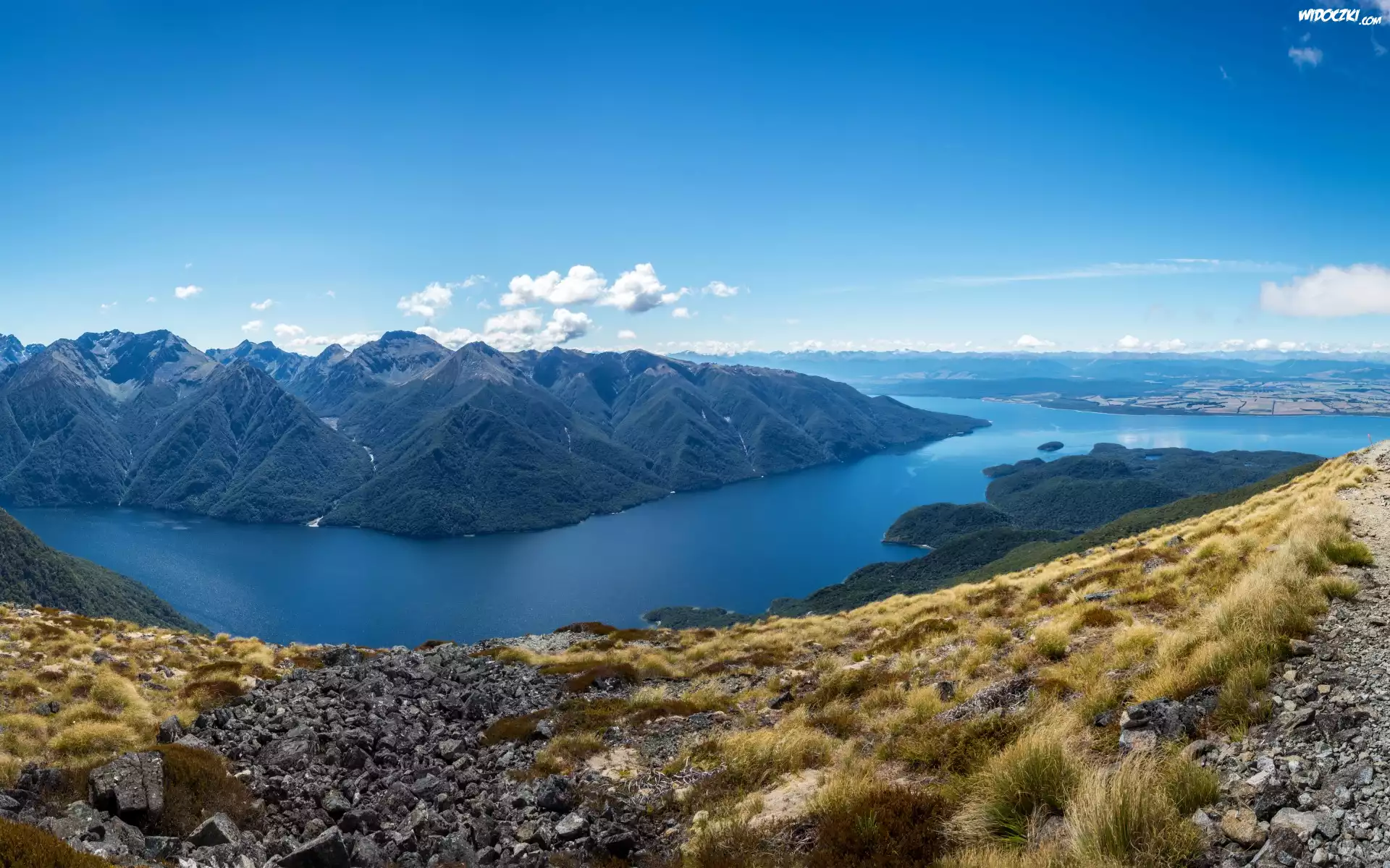 Góry, Kamienie, Trawa, Rzeka, Nowa Zelandia