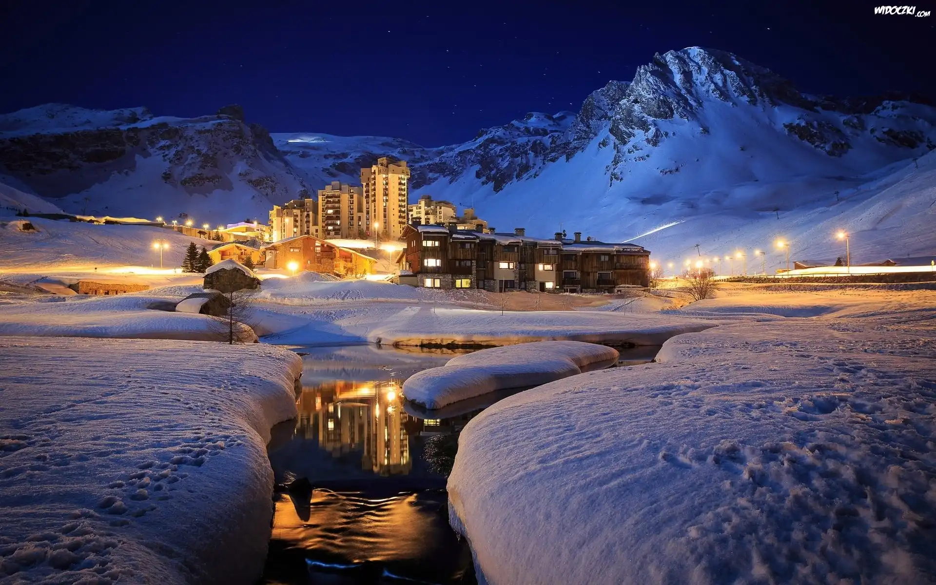 Zdjęcia, Góry, Oświetlone, Domy, Rzeka, Odbicie, Noc