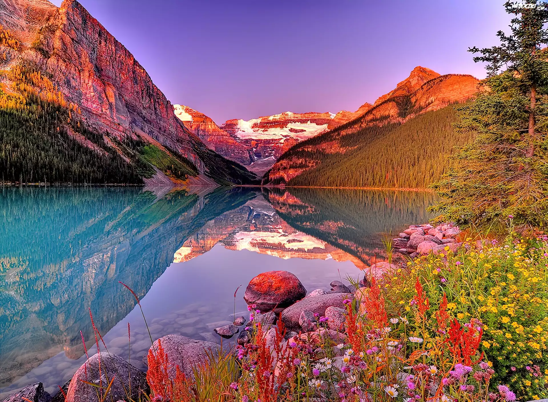 Zdjęcia, Góry, Jezioro, Odbicie, Kwiaty