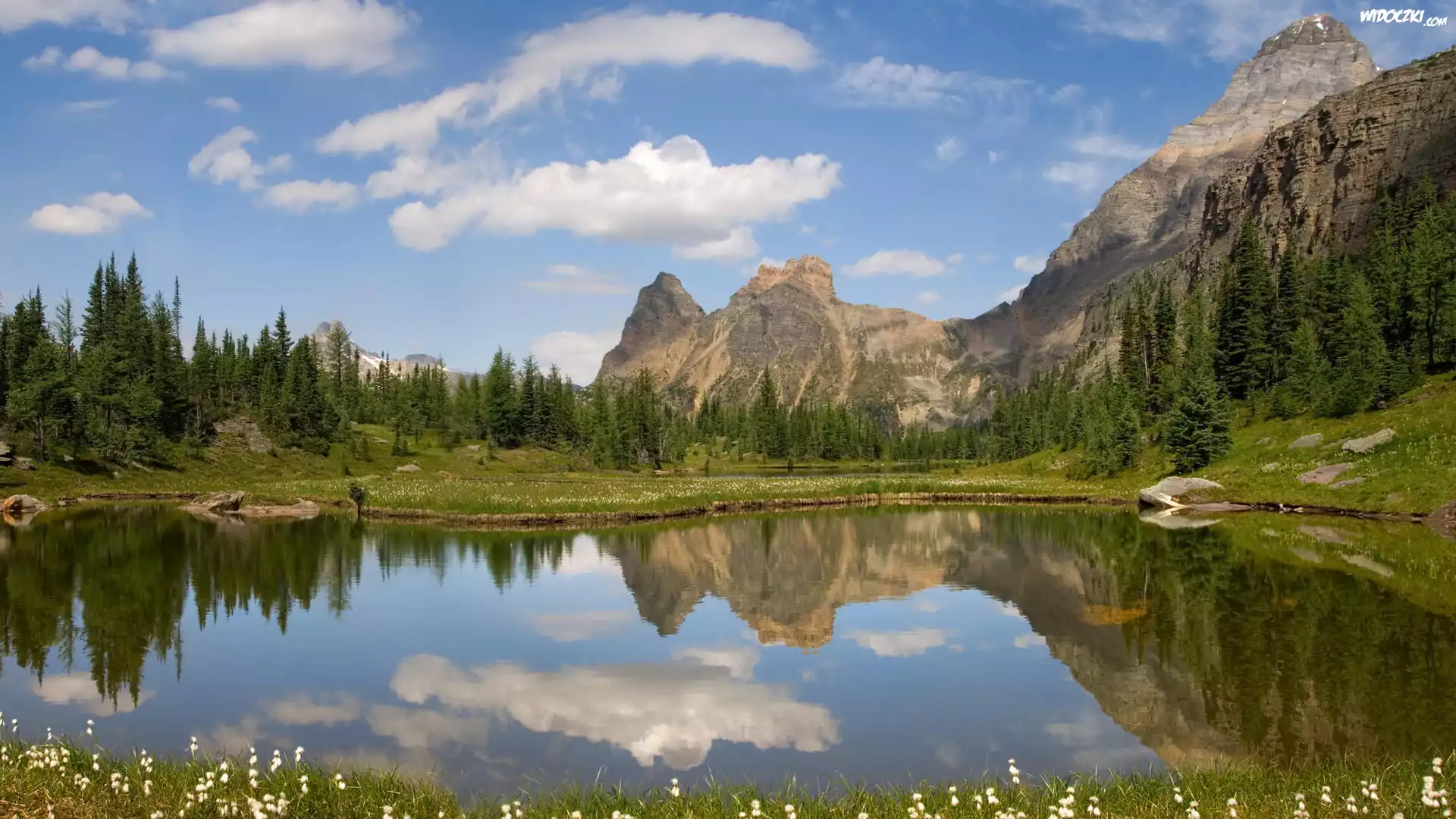 Zdjęcia, Góry, Drzewa, Staw, Chmury, Odbicie, Kwiaty