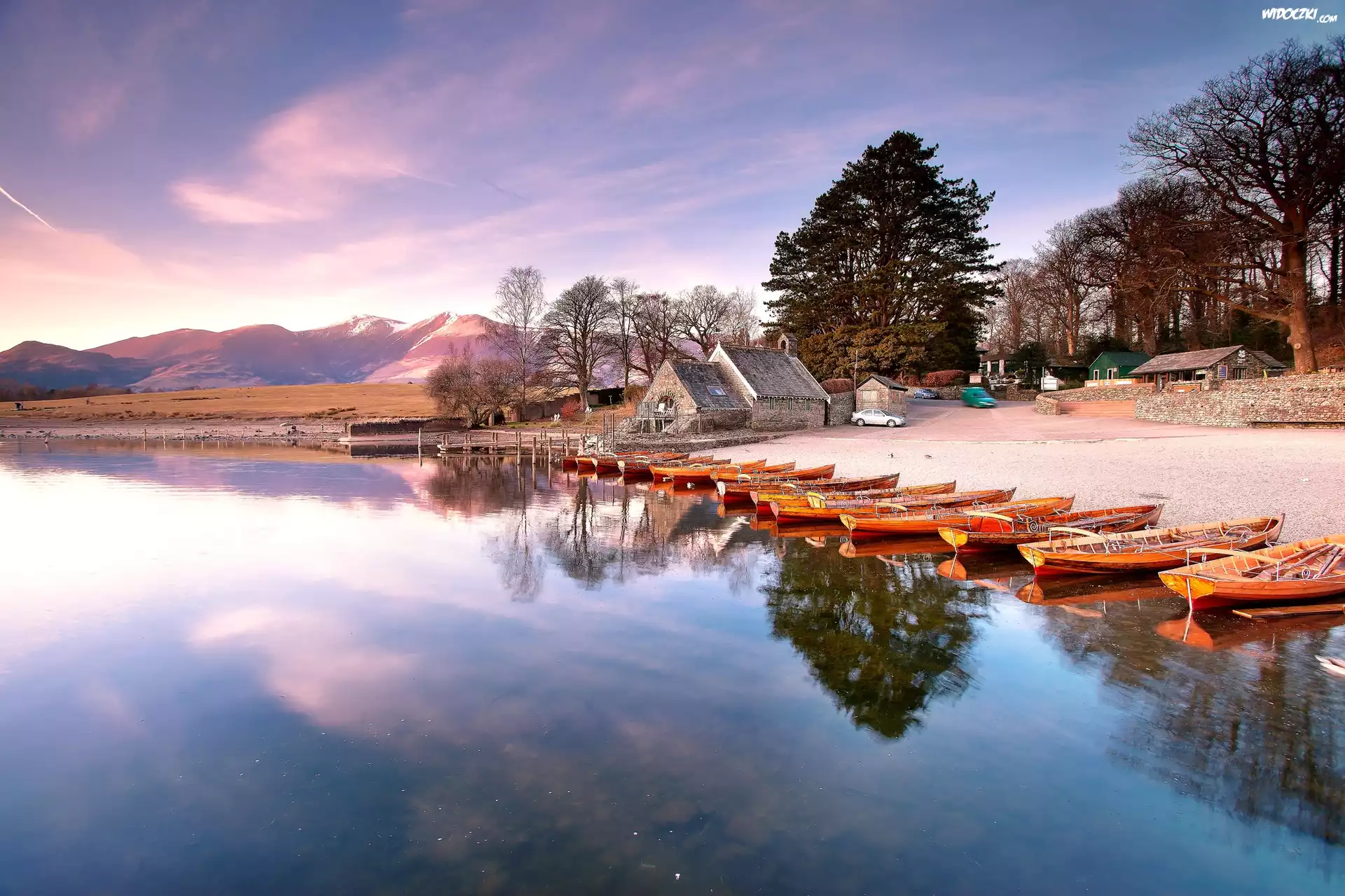 Zdjęcia, Góry, Jezioro, Plaża, Łodzie, Domy