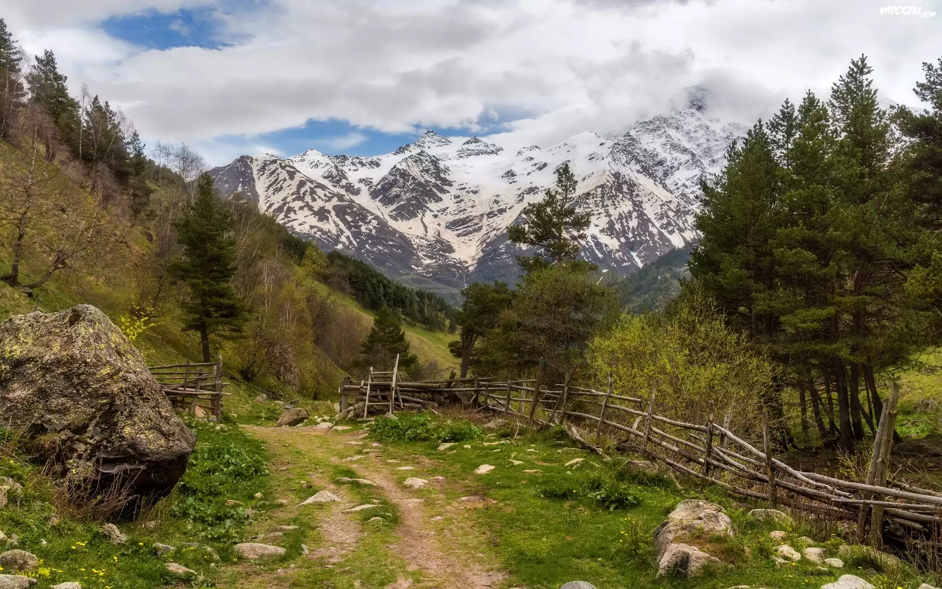 Zdjęcia, Góry, Drzewa, Droga, Ogrodzenie, Kamienie